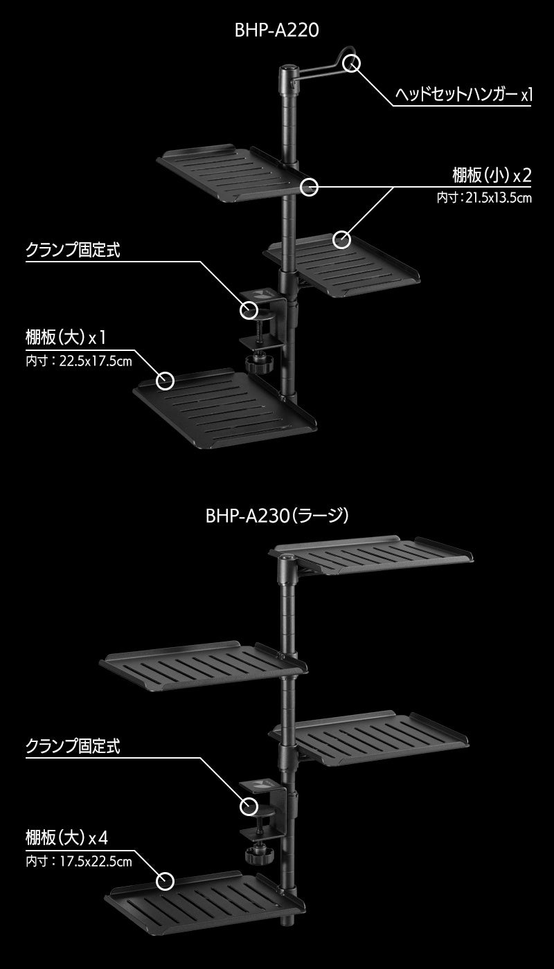 「より大きく、たくさんのモノを置きたい!」というユーザーの皆さまの声を受けて、ラージサイズを新たに開発しました。収納パーツには、BHP-A220でも好評だった大きな棚板を4つ付属。お持ちのアイテムや理想とするレイアウトに合わせて、組み合わせ・配置を自由にカスタマイズ可能です。浮かせる&積み上げる収納スタイルで、デスク上空のデッドスペースを活用可能。天板上の広々とした作業スペースを確保しつつ、デバイス類へのアクセスを最適化します。