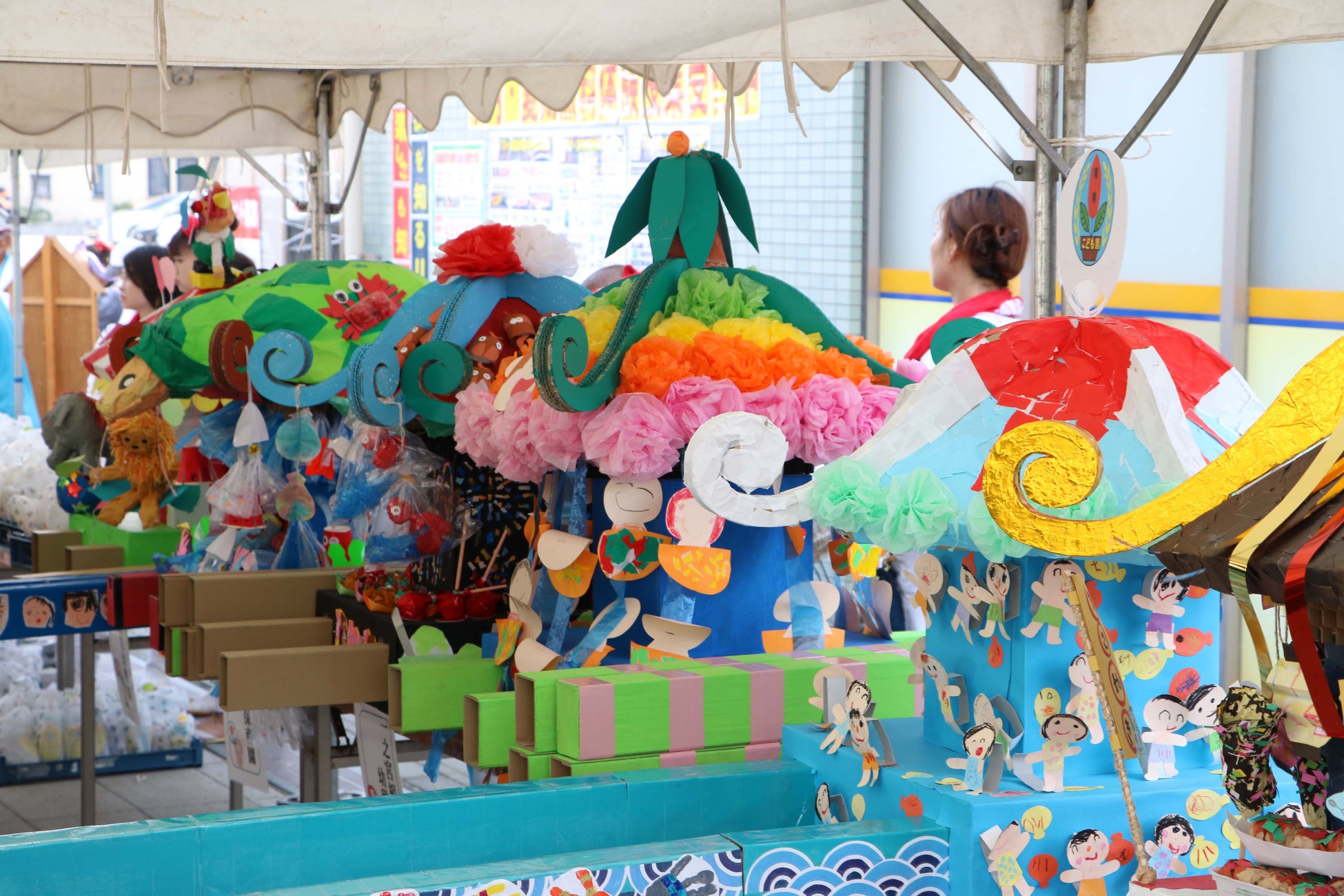「御旅所」となる寒川町商工会の隣接地に設けた特設会場では、段ボールのお神輿を自由に飾り付け、そのお神輿を実際に担いで歩く「こども 神輿体験」を開催。