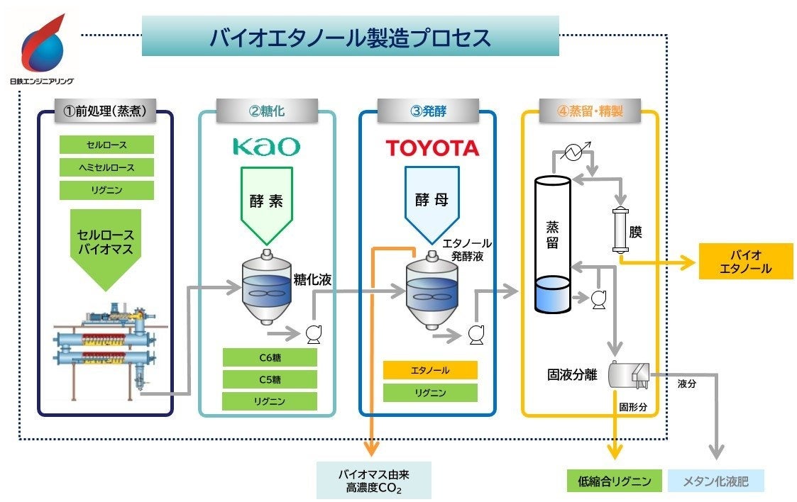 ※4 糖化工程(図中②)では、当社はこれまでに花王株式会社(以下「花王」)と非可食性バイオマスを効率的に分 解できる酵素の生産菌を利用したオンサイト酵素生産技術を共同で開発するなどの協業を行ってきました。今回 のバイオエタノール生産設備では、花王が開発した非可食性バイオマスを高効率で糖化することが可能な糖化酵 素を使用する予定です。