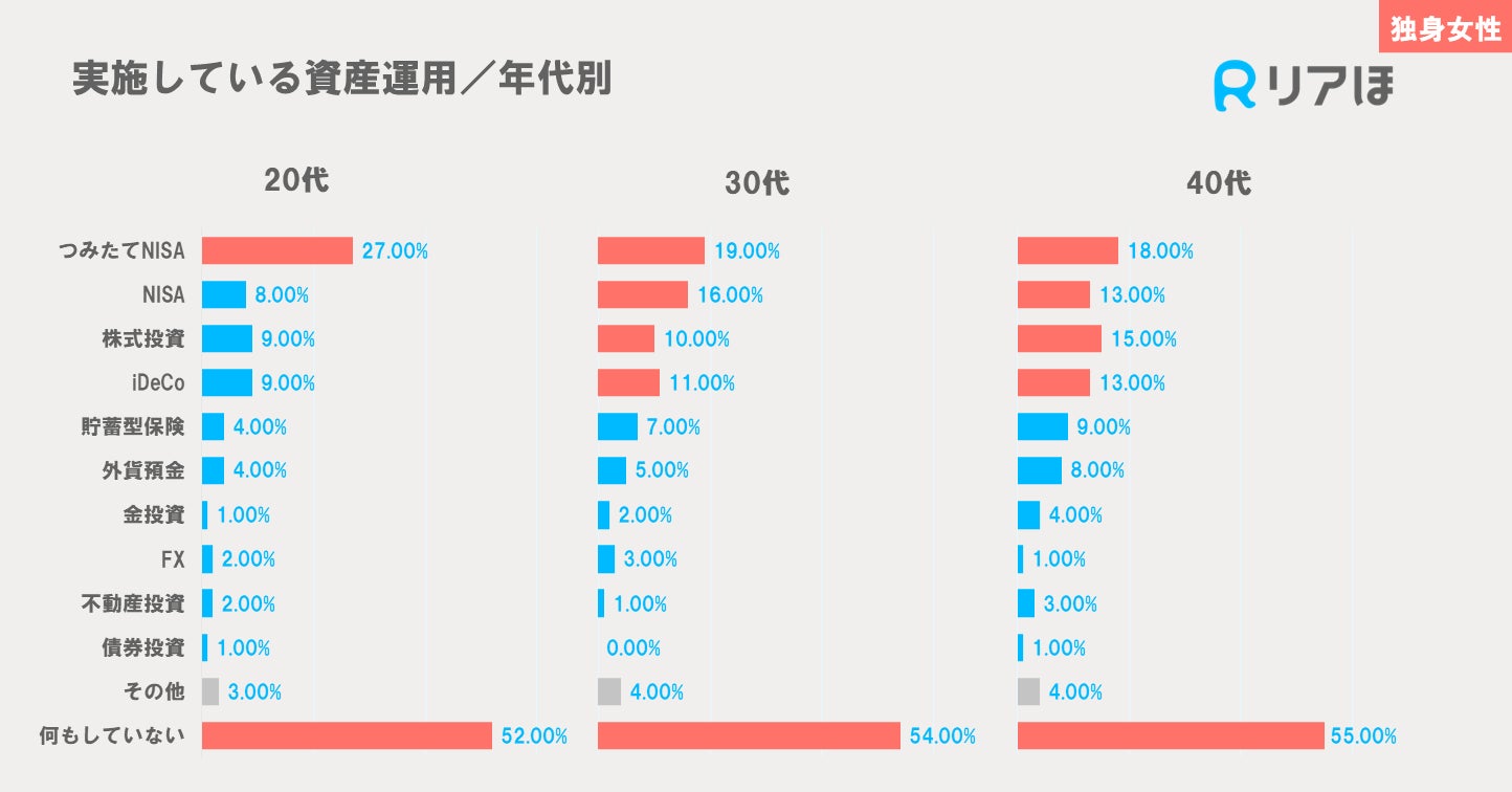 また、30代、40代では「NISA」「株式投資」など、選択する方法が分散しているのに対し、20代では「つみたてNISA」を選択する方の割合が圧倒的に多く、長期積立投資でリスク分散したいという意向が伺える結果となりました。