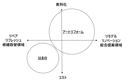 リフォームは大別すると4つの領域に分かれます。修繕・営繕のリペア、設備機器入替のリフレッシュ、内装設備全面入替のリモデル、デザイン・間取りまでを変えてしまうリノベーション。アートリフォームはリモデル、リノベーションの総合提案領域を得意とし、リフォームはまのはリペア、リフレッシュの修繕取替領域を得意としています。今後、それぞれの得意領域を補完しあい関西全域全てのリフォーム案件に対応できる体制を構築していきます。