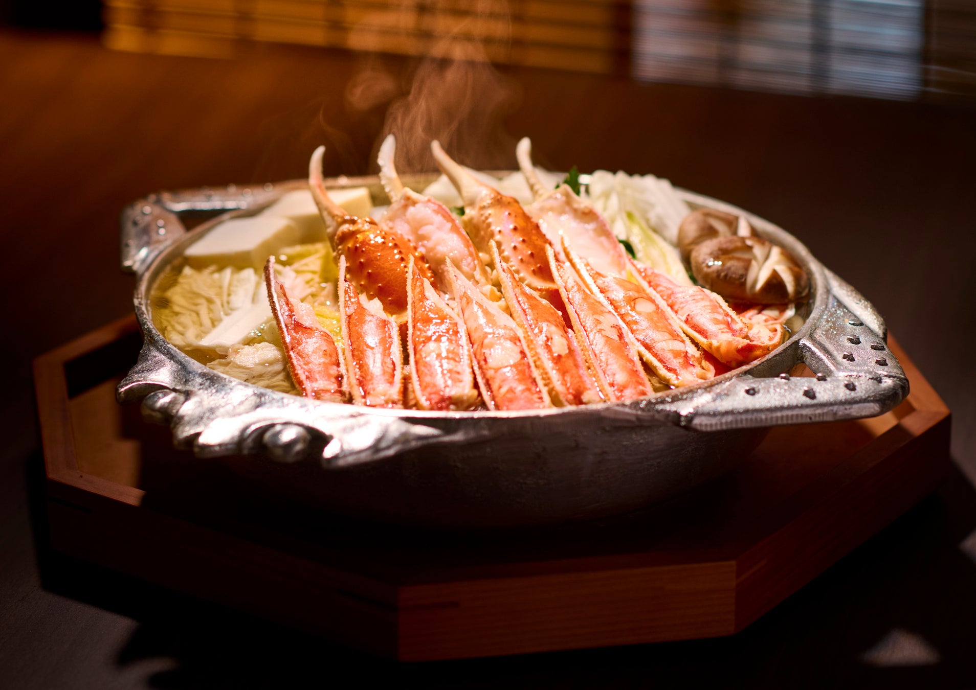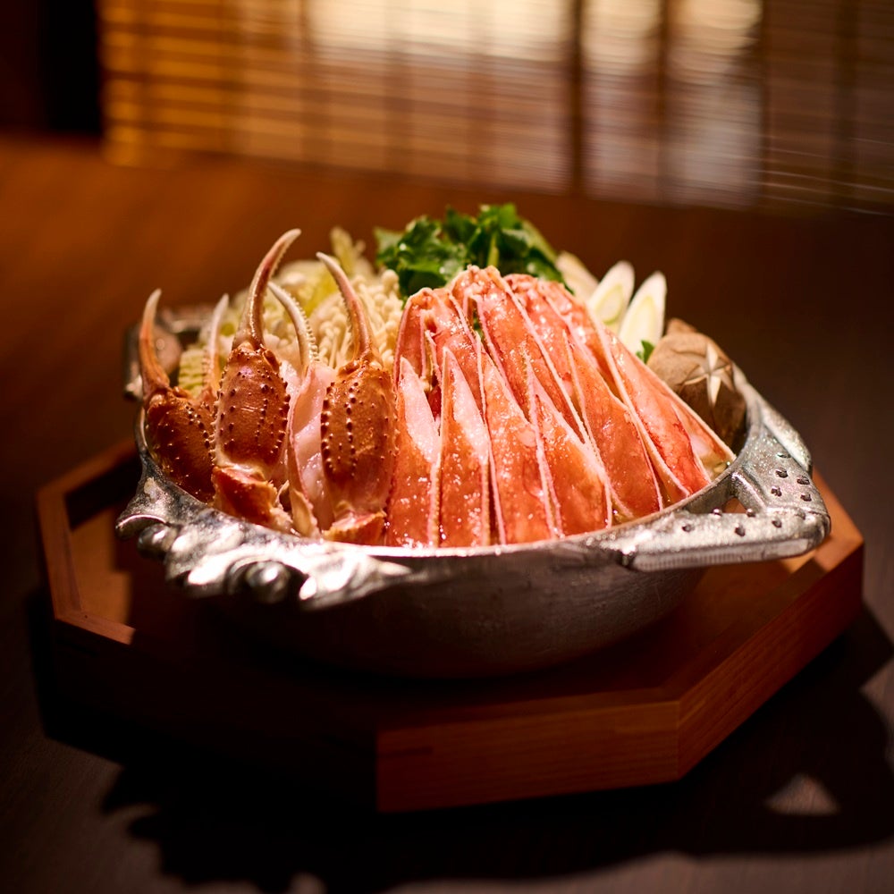 水揚げされた松葉かにを生きたまま仕入れ、丁寧に捌き、黄金出汁にくぐらせる瞬間ふわりと花のように開く身と脚肉から立ちのぼる香りは、まさに冬の美味の極みです。