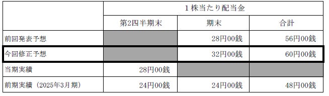 2026年3月期の親会社株主に帰属する当期純利益が当初予想を上回る見込みであることから、 2026 年3月期期末配当金につきましても見直すことといたしました。株主還元方針(配当性向 40%)に基づき、 2026年3月期の1株当たりの期末配当金を4円増配の32円とするものです。この結果、年間の1株当たりの配当金は60円となり、配当性向(連結)は、40.3%となる見込みです。