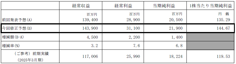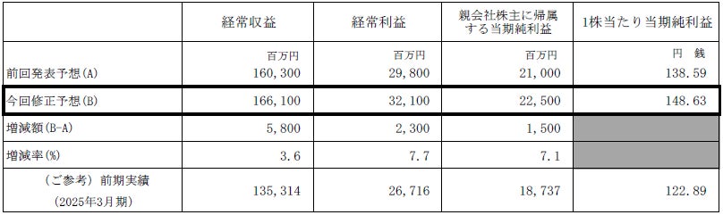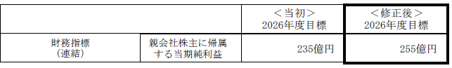 最近の業績動向を踏まえ、2025年11月13日に公表した2026年3月期通期業績予想及び期末配当予想並びに2024年2月22日に公表した中期経営計画の最終年度目標を下記のとおり修正しましたのでお知らせします。