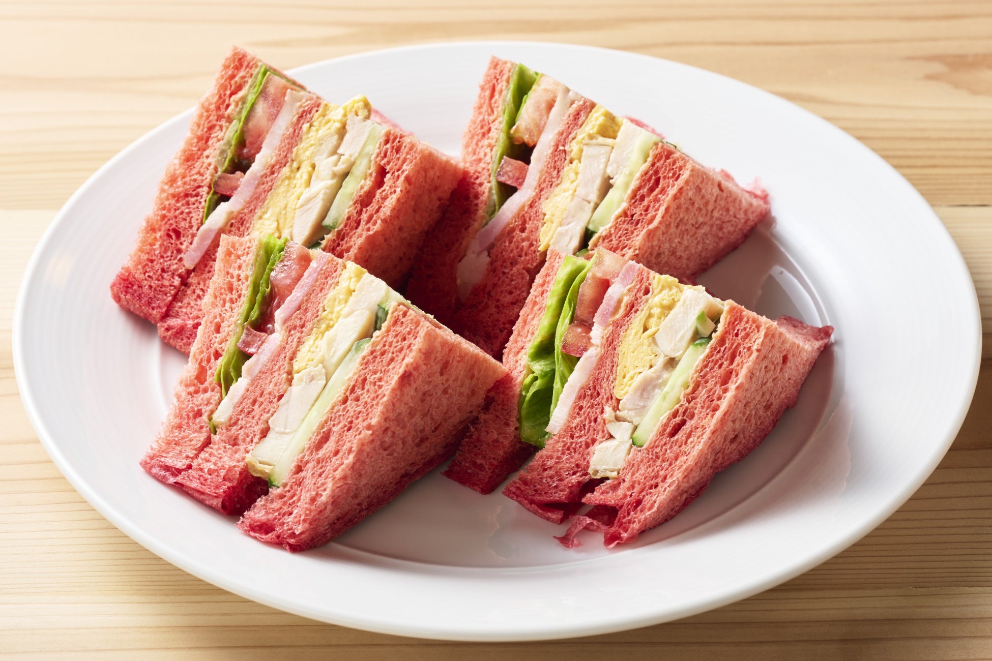 ビーツとラズベリーで着色し、ほんのり甘く、耳もソフトに味わえる特製の食パンを使用しています。