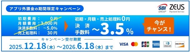 クレジットカードをはじめとする決済サービスを提供する株式会社ゼウス(本社:東京都渋谷区、代表取締役:金子雄一、以下「当社」)は、2025年12月18日に「スマートフォンにおいて利用される特定ソフトウェアに係る競争の促進に関する法律(以下、「スマホソフトウェア競争促進法」、通称「スマホ法」)」※1が全面施行されたことに伴い、ゲームアプリやマンガアプリ、音楽や動画など定額課金アプリ向けの決済「アプリ外課金」の受付を開始しましたので、お知らせいたします。また、本リリースに伴い、「アプリ外課金」リリースキャンペーンを実施いたします。