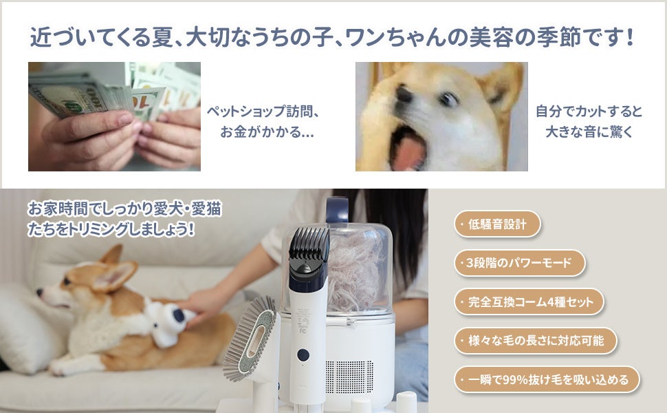 バリカン、ブラッシング、掃除機の一台多役!サロン級の感覚でペットケアを!