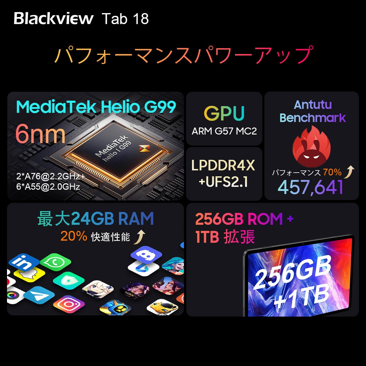 Tab 18はCPU(SoC)に「MediaTek Helio G99 オクタコアプロセッサー」を搭載しており、12GB RAM(最大24GBまで拡張可能)を採用。内部ストレージは256GBを用意しているほか、マイクロSDカードの挿入で最大1TBまで拡張することが可能です。