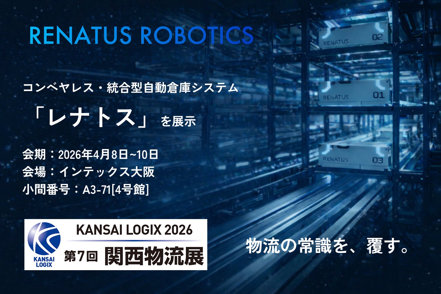 RENATUS ROBOTICS(レナトスロボティクス)は2026年4月8日(水)~10日(金)にインテックス大阪で開催される第7回 関西物流展(KANSAI LOGIX 2026)にコンベヤレスな統合型自動倉庫システム「レナトス」を出展する。