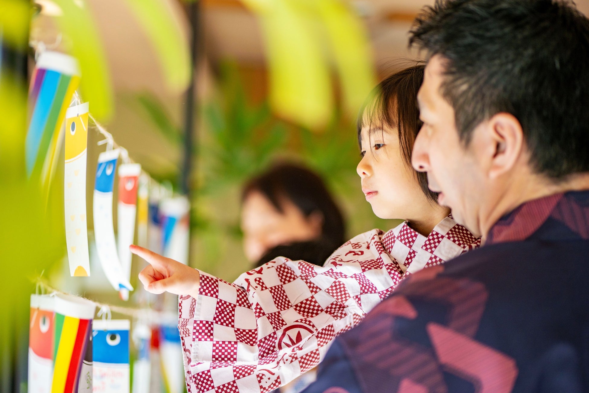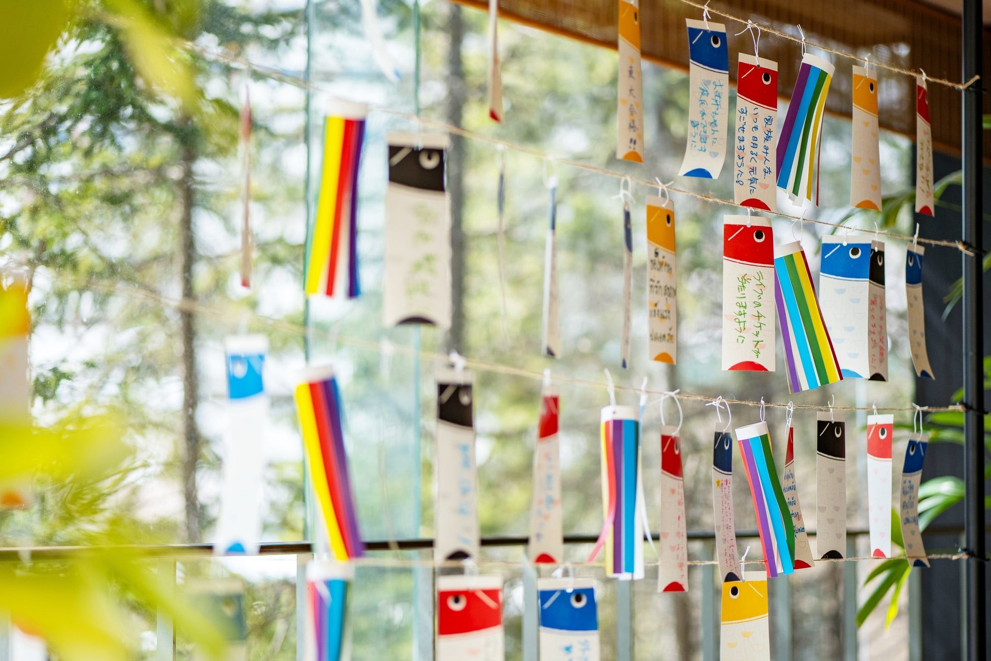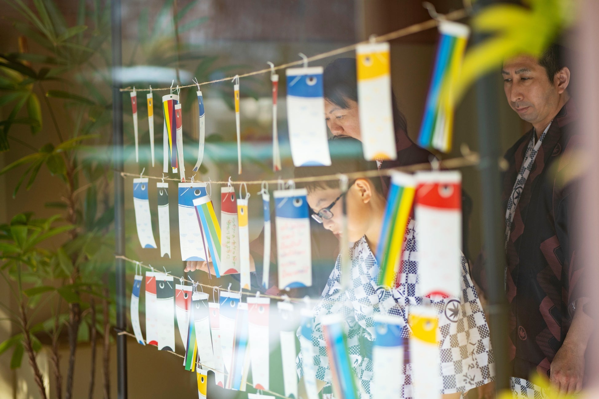 短冊はご自身の願いの数に合わせて、何枚でも自由にお書きください。当館にご宿泊の方はもちろん、日帰り入浴でお越しの方も、この鯉のぼりを楽しみにご来館される方も、どなたでも無料でお楽しみいただけます。