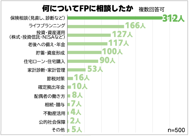 今回は、「FP相談についてのアンケート(自社調べ)」としてFPに相談したことのある男女500人に、どのようなことを相談したのか聞いてみました。