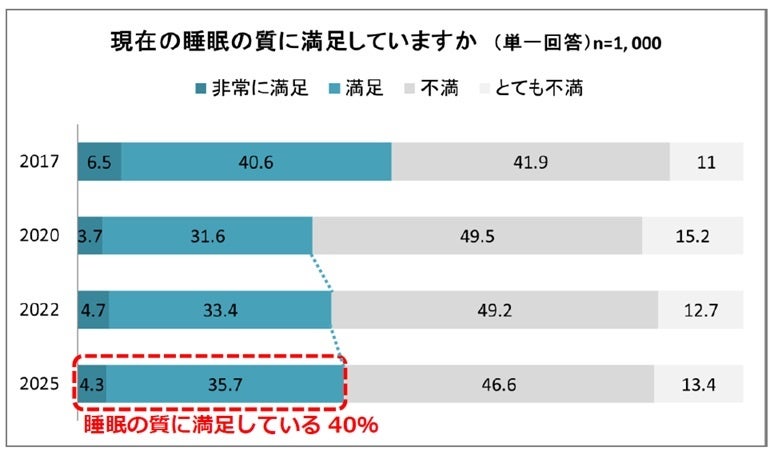 現在の睡眠に対する満足度を「満足」「非常に満足」と答えた人の割合が40%となり、コロナ明けの過去5年間の調査と比べて上昇傾向が見られました。