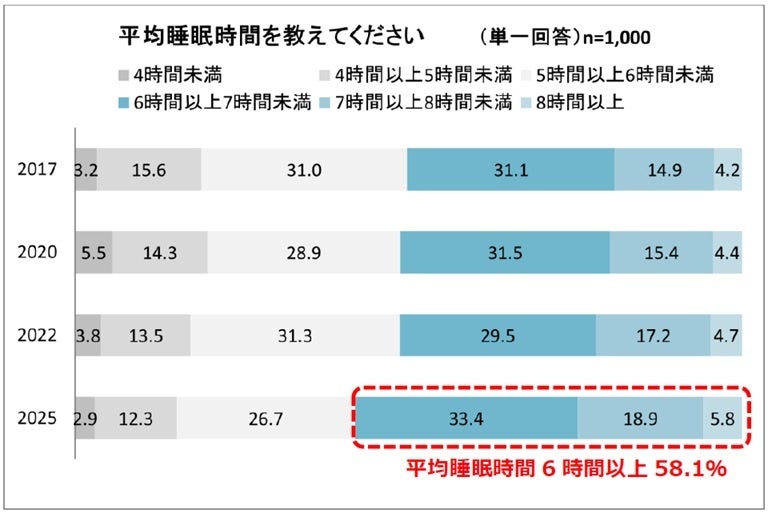 また、平均睡眠時間が6時間以上の人の割合は「過去調査の約50%」から「今回約60%」へと増加しており、睡眠時間の確保が進んでいる可能性が示唆されます。