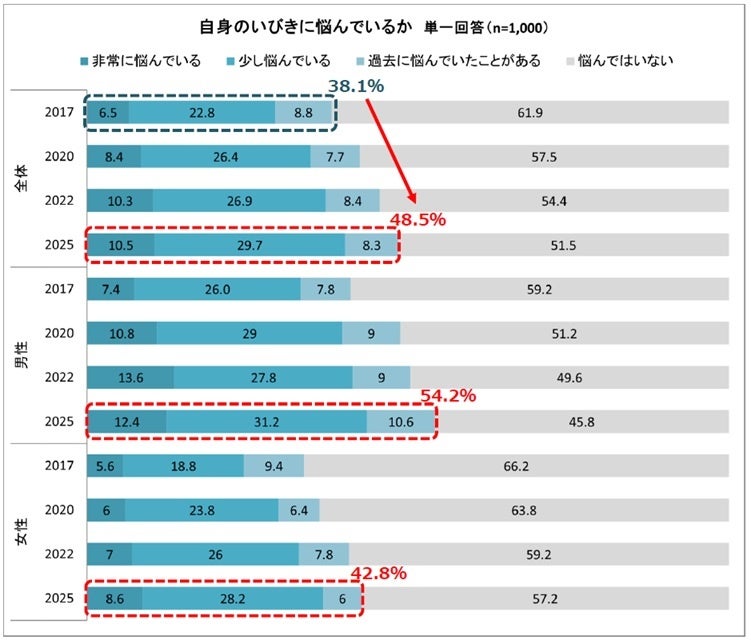 2017年は38.1%だったいびきに悩んだ経験のある人が、2025年には48.5%まで増加。特に男性の54.2%、女性の42.8%は自身のいびきを意識しており、性別を問わず、いびきが主な睡眠トラブルとなっています。