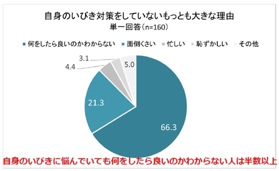 自身のいびきに悩む人に、いびき対策をしているかを聞いたところ、70%が何かしらの対策をしているものの、約30%が「何もしていない」と回答。その理由として「何をしたら良いかわからない」が66.3%と最も多く、悩みはあるが手立てがわからない人が多数を占めています。