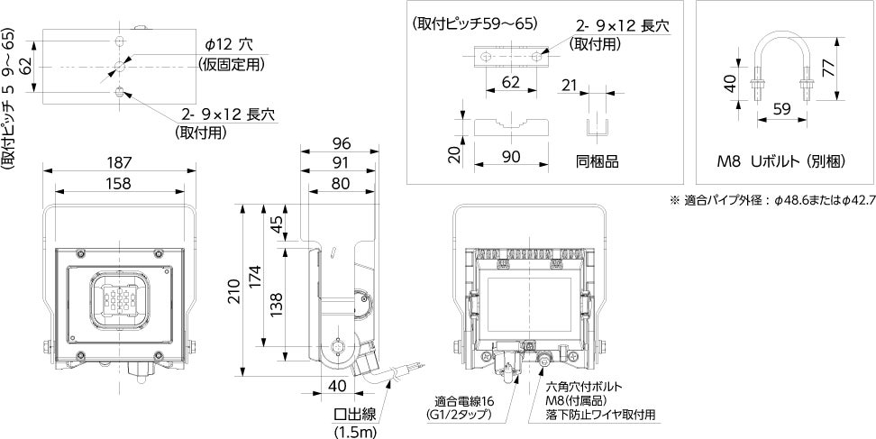 手すりへの取付作業負荷を軽減するU字ボルトの採用で、手すり径ø48.6mmとø42.7mmの2種類の径に対応可能。