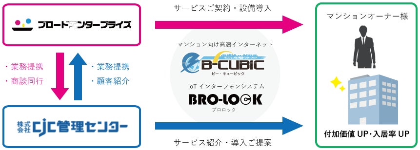 CJC管理センターが主たる事業とする賃貸物件管理事業にて、ブロードエンタープライズのマンション向け高速インターネット「B-CUBIC」及びIoTインターフォンシステム「BRO-LOCK」を、賃貸物件の所有者に導入提案を行います。なお、具体的な実施内容につきましては、今後、物件ごとにカスタマイズされた提案内容を、それぞれ個別に締結する契約書において詳細を定める予定です。