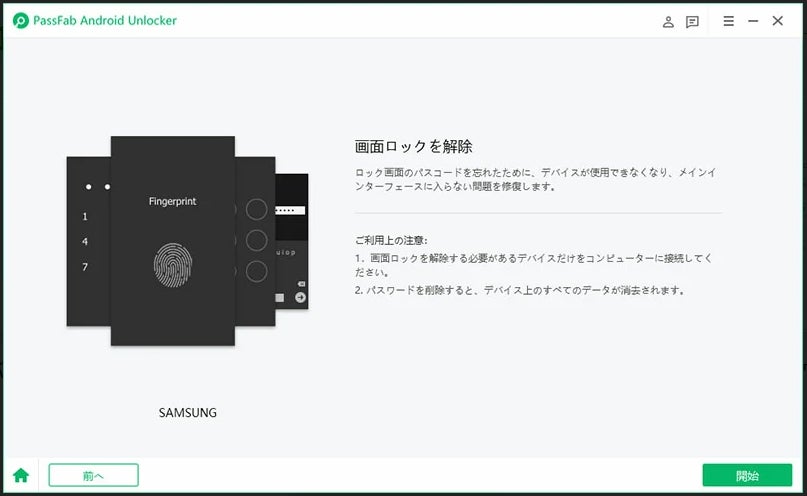 ※注意!このソフトで画面ロックを解除すると、スマートフォンのデータが削除されます。