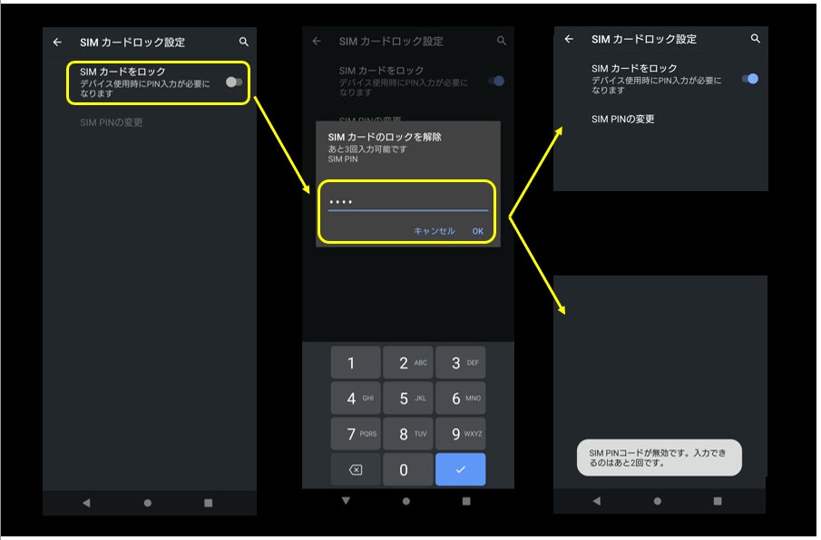 Step4:PINコードが間違っていた場合は「SIM PINカードが無効です。入力できるのはあと〇回です」と表示され、あっていた場合はロックがかかります。