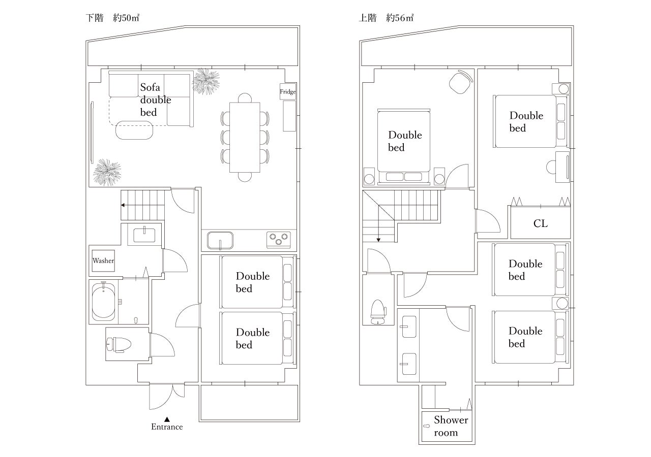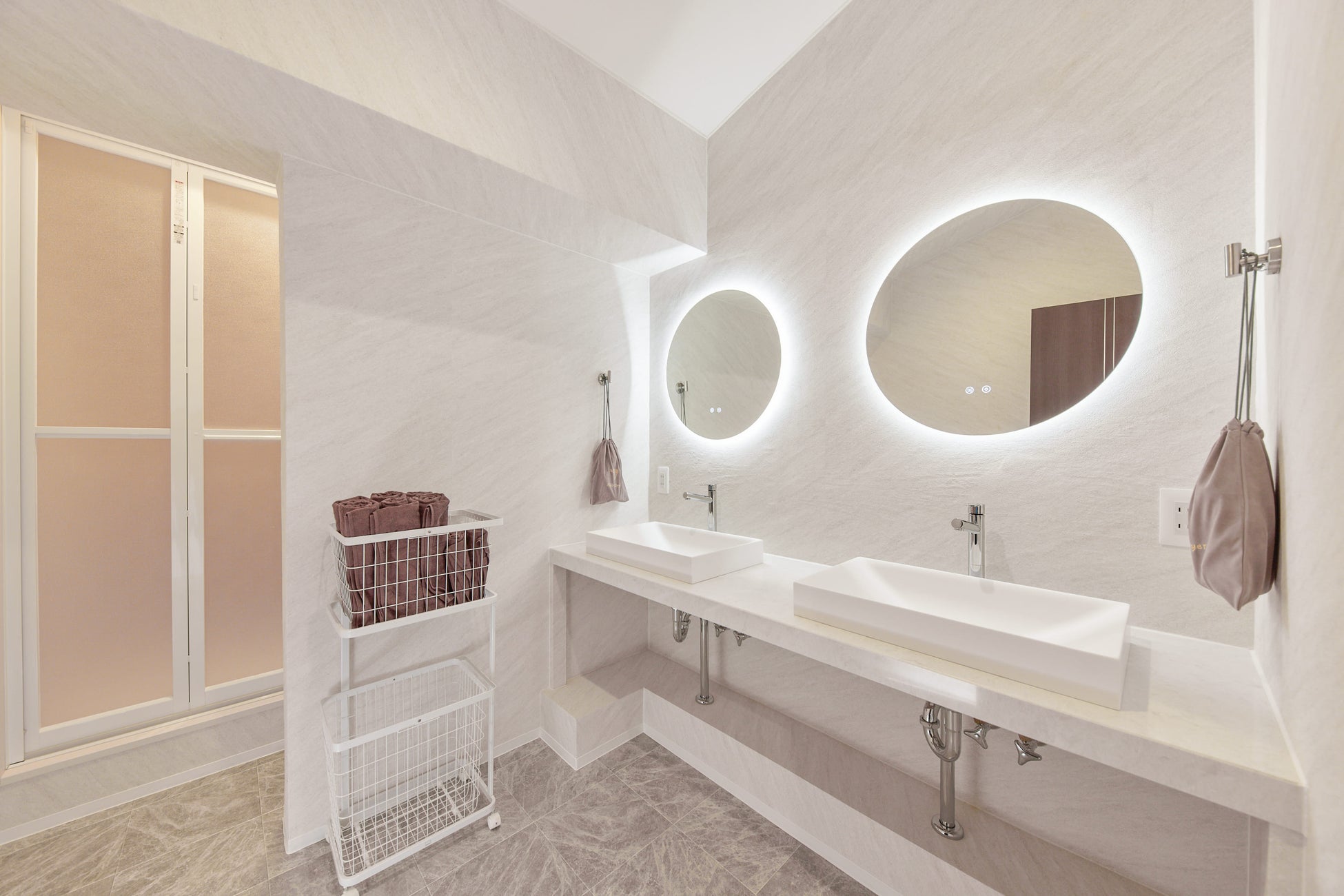 水廻りには「eni.」施設の特徴でもある円形のミラーを採用。LDK同様、内装は白を基調に構成。空間に清潔感を与えます。浴室は上下階それぞれ設置しているので、大人数のグループ旅行も安心です。お湯を溜めれる浴槽付タイプと、シャワールームタイプと両方設置しているので、お好みに合わせた入浴スタイルを選ぶ事が可能です。