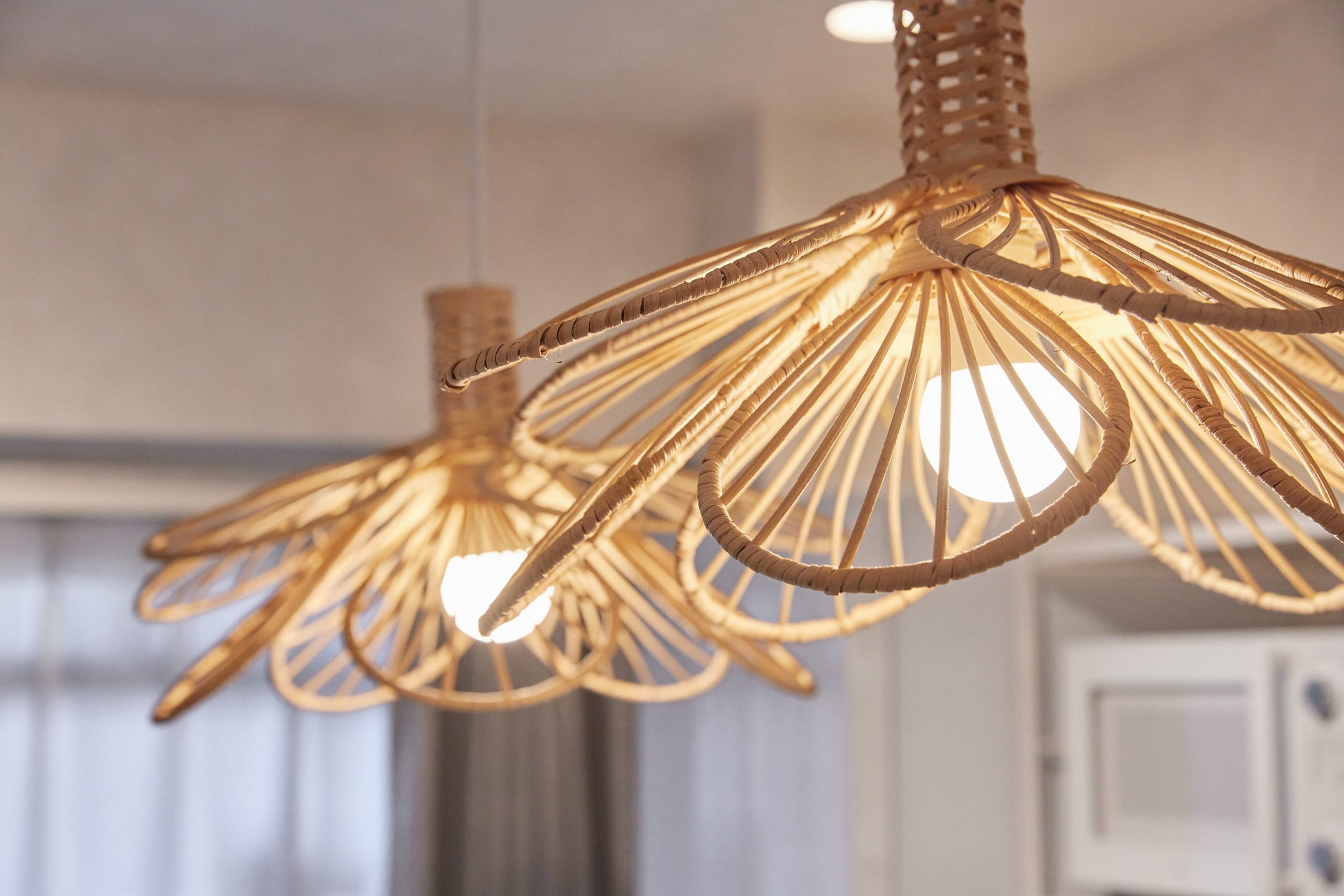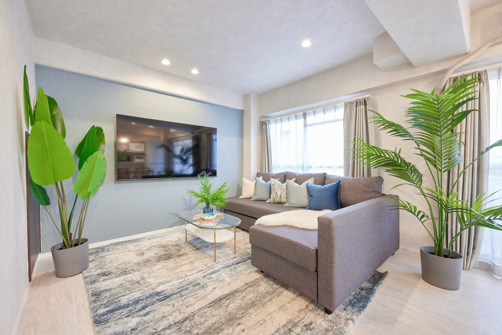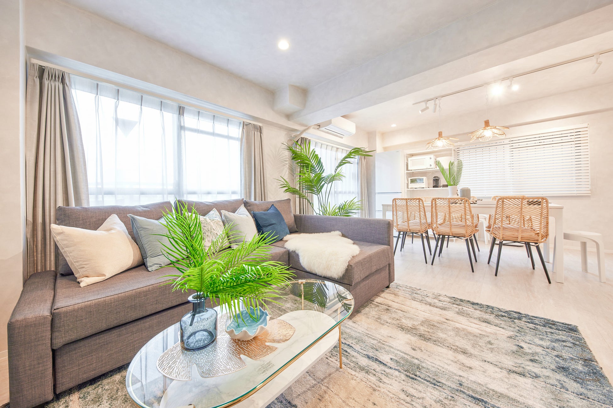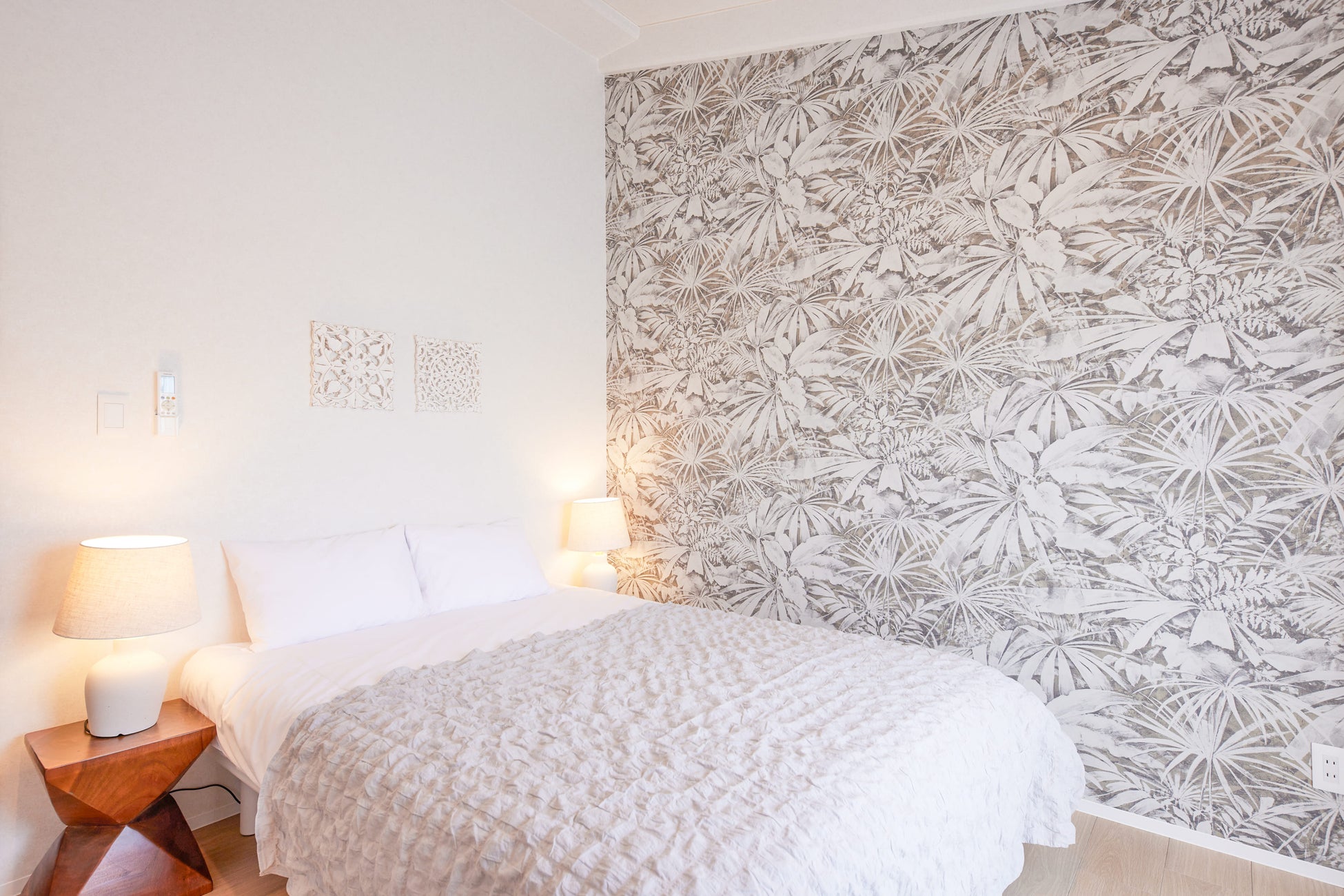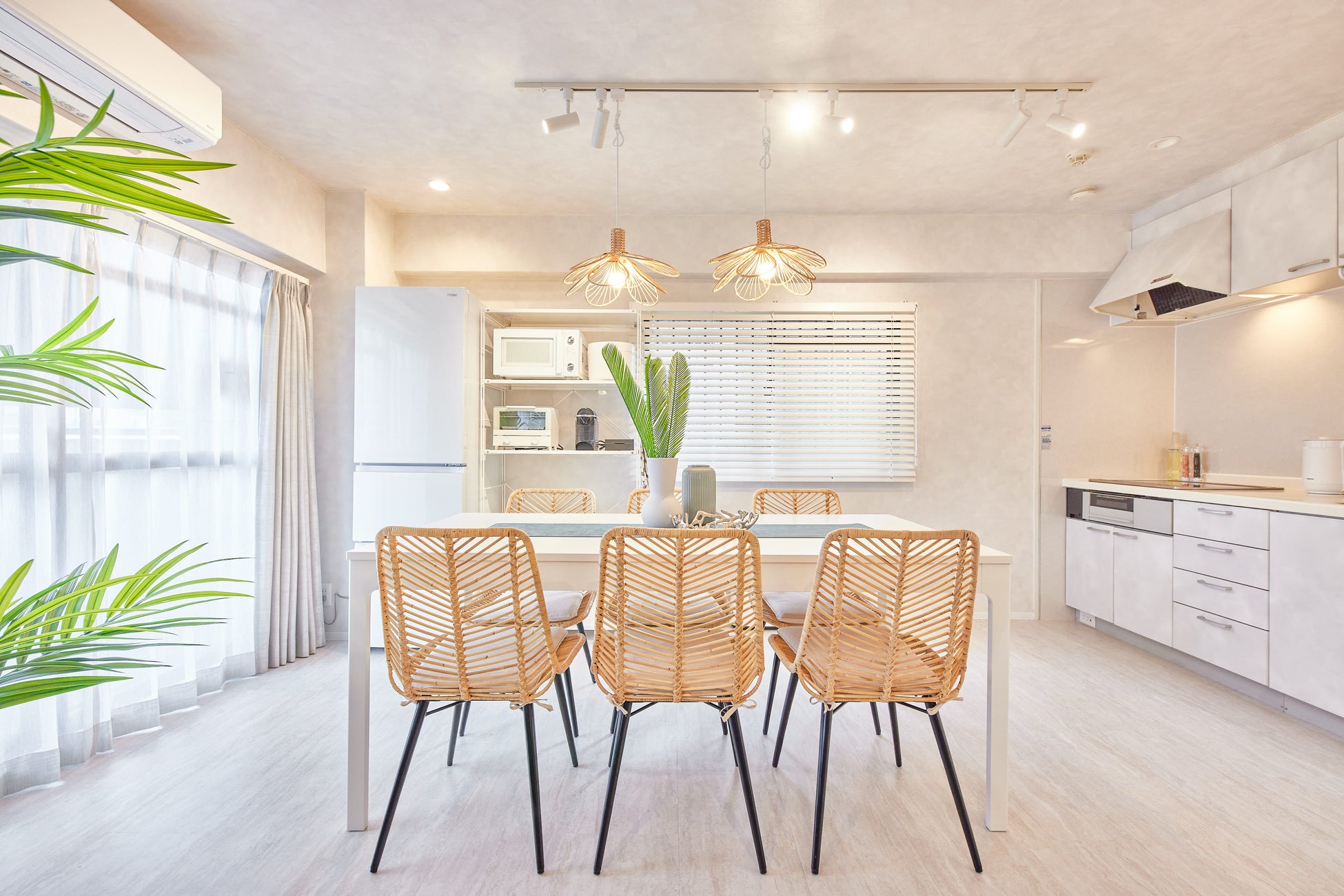 当施設はマンションの最上階にあり、上下2階建てのメゾネットタイプとなっています。施設全体の広さは約106㎡、寝室は合計4部屋あり最大で14名までの宿泊が可能です。マンションの最上階で景色が抜け光がよく入り、施設全体が明るいのが特徴です。内装は白をベースに、特徴的な家具や大振りの観葉植物、アクセントクロスで空間にメリハリを加えました。まるでリゾート地にいるかのような気分で、ゆったりくつろぐ事ができます。