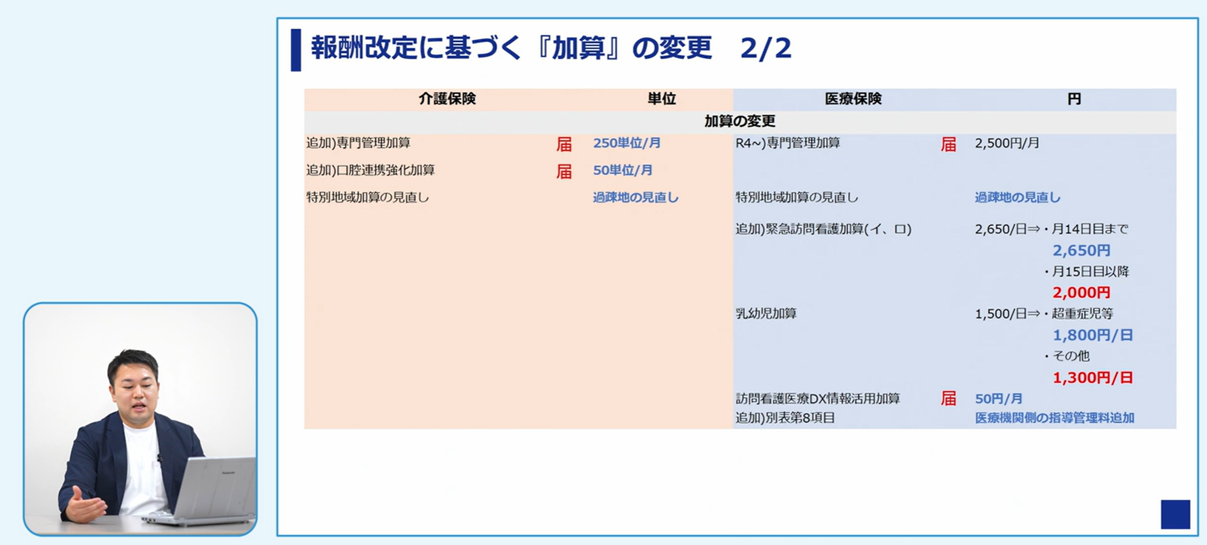 介護報酬・診療報酬における加算項目について、「頻出する加算」「事業所によって算定する頻度が変わる加算」「精神科訪問看護で算定する加算」「複数事業所で介入する時に気を付けておきたい加算と事業所間契約」に分けて解説しています。2024(令和6)年度に改定された項目には「改」マークを、新設された項目には「新」マークを入れています。