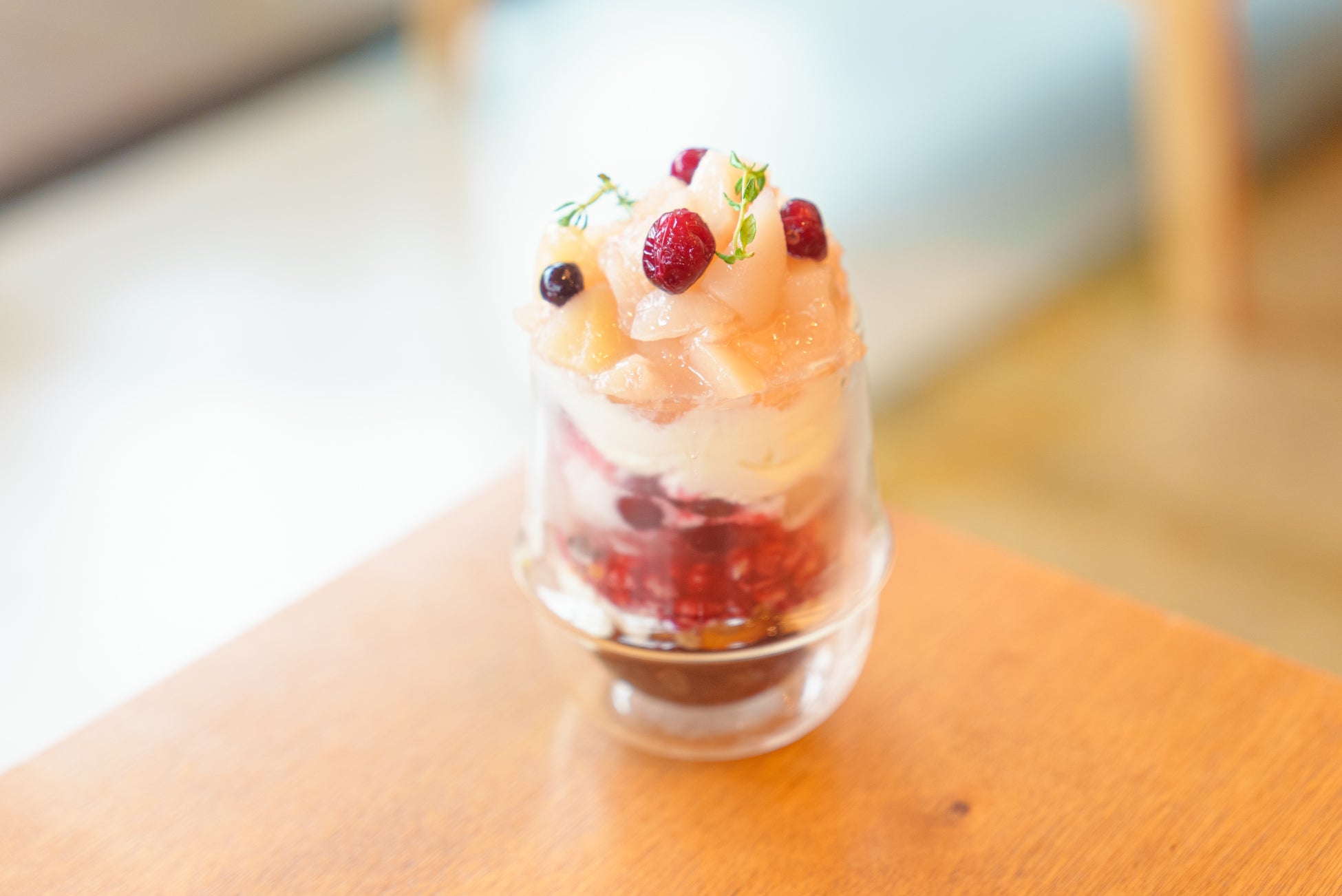 ごろごろの桃果肉をたっぷり贅沢に使い、白桃シャーベットや桃のピューレなど、桃をたっぷり使ったパフェに爽やかな自家製アールグレイゼリー、サワーヨーグルトアイスを組み合わせました。ジューシーな桃と香り高いアールグレイの爽やかな味わいが夏にピッタリです。