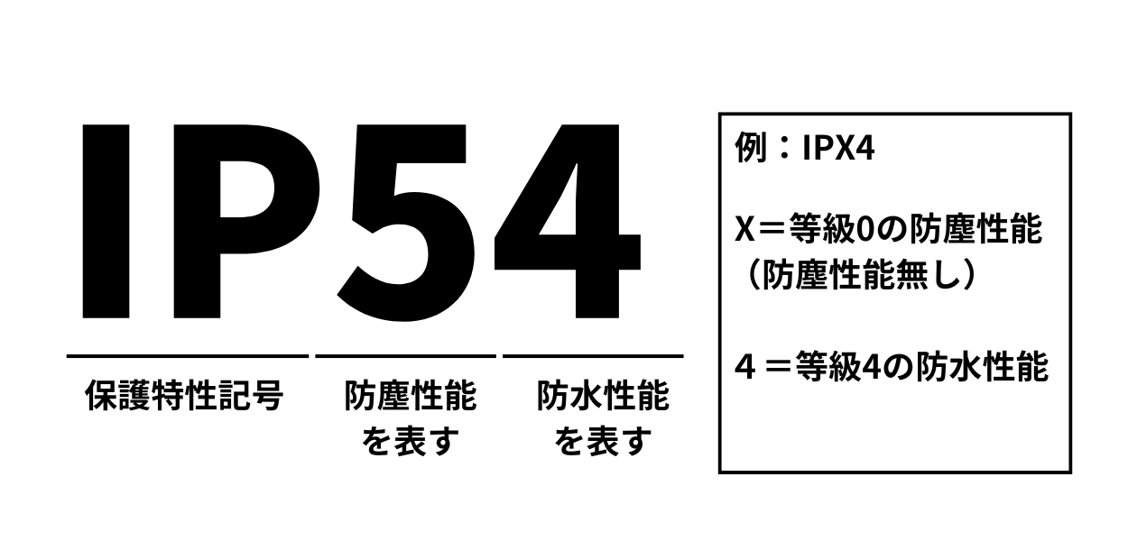 「IP〇〇」の〇〇の部分には、数字、またはXが入り、一つ目が防塵の等級を、二つ目が防水の等級を示しています。(Xは等級0という意味です)