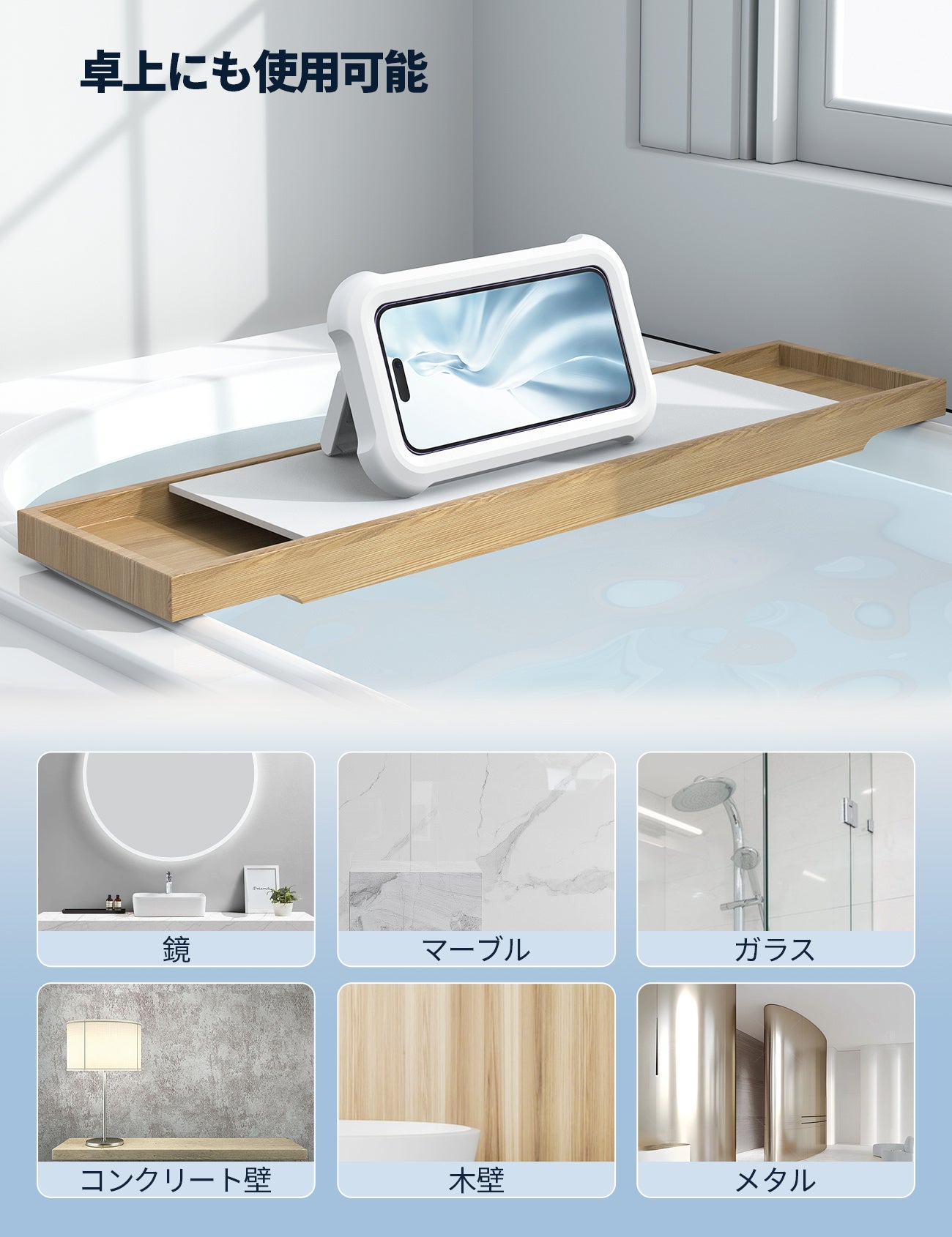 本製品は、貼り付けたい場所に3枚の強力シールを貼り、ケースを固定して使用します。そのため、マグネットのように設置場所を選ぶことなく、木やメタル、コンクリートなどさまざまな素材の壁に使用できます。また、スタンドが付いており、浴室の縁に立てかけて使うことも可能です。また、約4〜7インチのスマホに幅広く対応しているため、ご家族でシェアして便利にお使いいただけます。