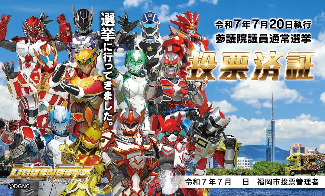 福岡市選挙管理委員会とドゲンジャーズ製作実行委員会(主幹事:株式会社エムマーケットエージェンシー(以下MMA、代表取締役 下青木 秀輝)は参院選(7月3日公示、20日投開票)の投票済証に、福岡を舞台とするドゲンジャーズを起用する事を発表した。