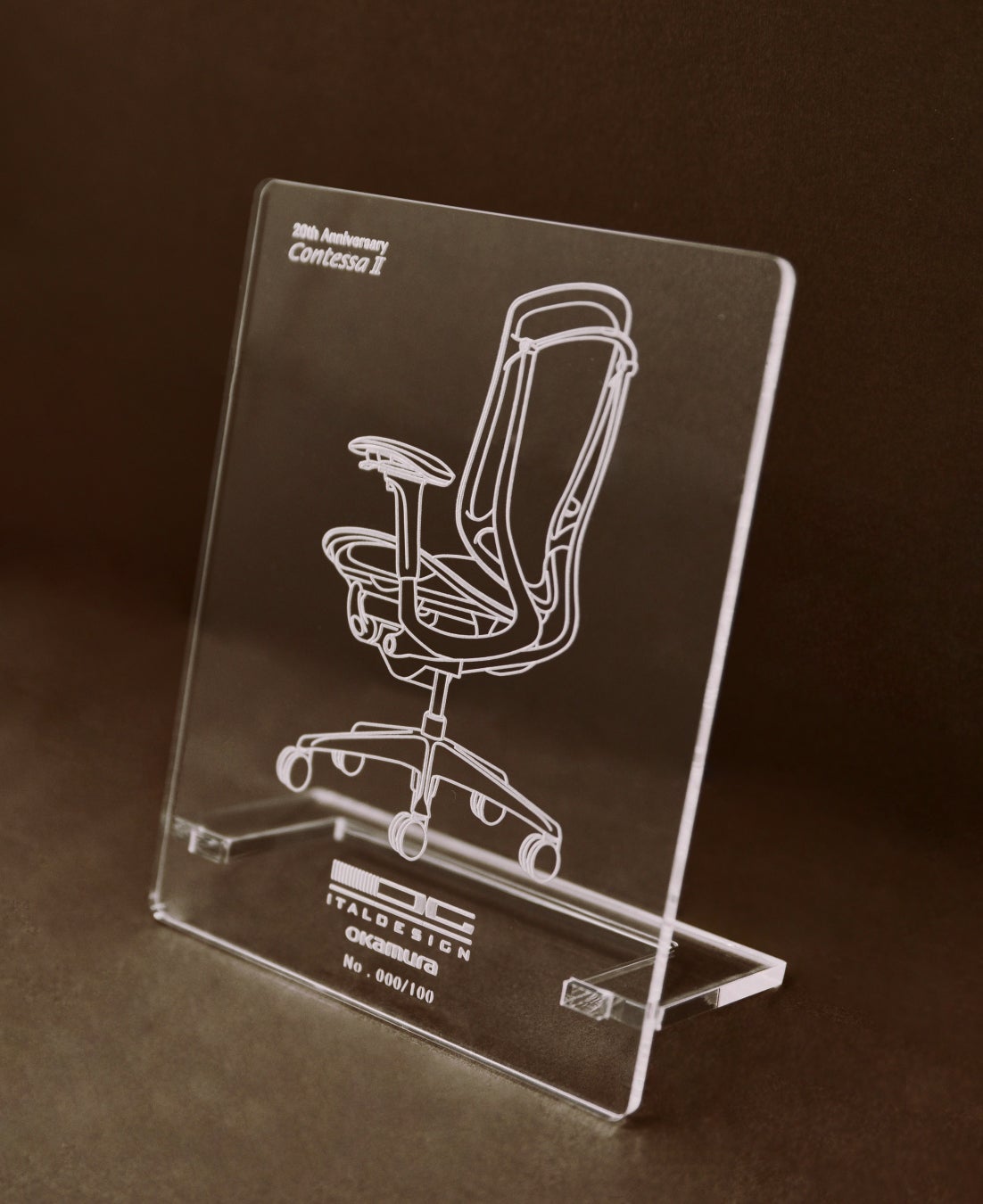 20th アニバーサリーモデルは、「Contessa」のアイコンである流麗なアルミフレームをスペシャルカラーでカスタマイズし、背メッシュフレームにイタルデザインとのコラボレーションを象徴するエンブレムを記しました。「Contessa」が築いてきた威厳を漆のような深い艶のあるブラックで表現した「ディープブラック」カラーと、これからの輝かしい未来への幕開けを表現した華やかな「アクセントカッパー」カラーの2種。座はメッシュとクッションから選択可能です。各カラー50台ずつ合計100台を、「OKAMURA Lifestyle Store」で2023年3月29日より限定発売します。