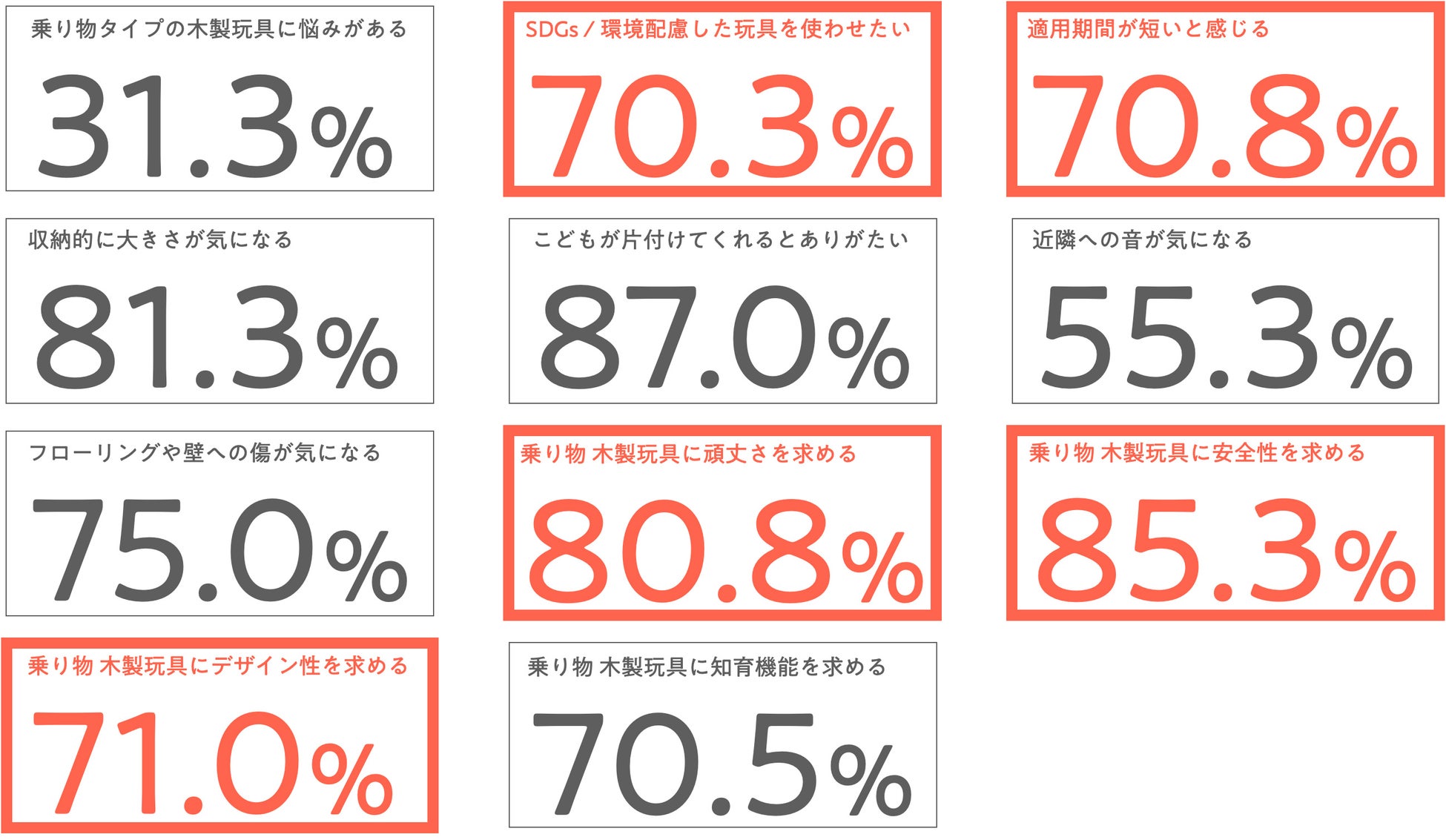 また、モビリティに対する様々なお悩みが浮上する中で、「こどもの成長が早く、玩具の適用期間が短いことを気にしている」という事実も明らかに。