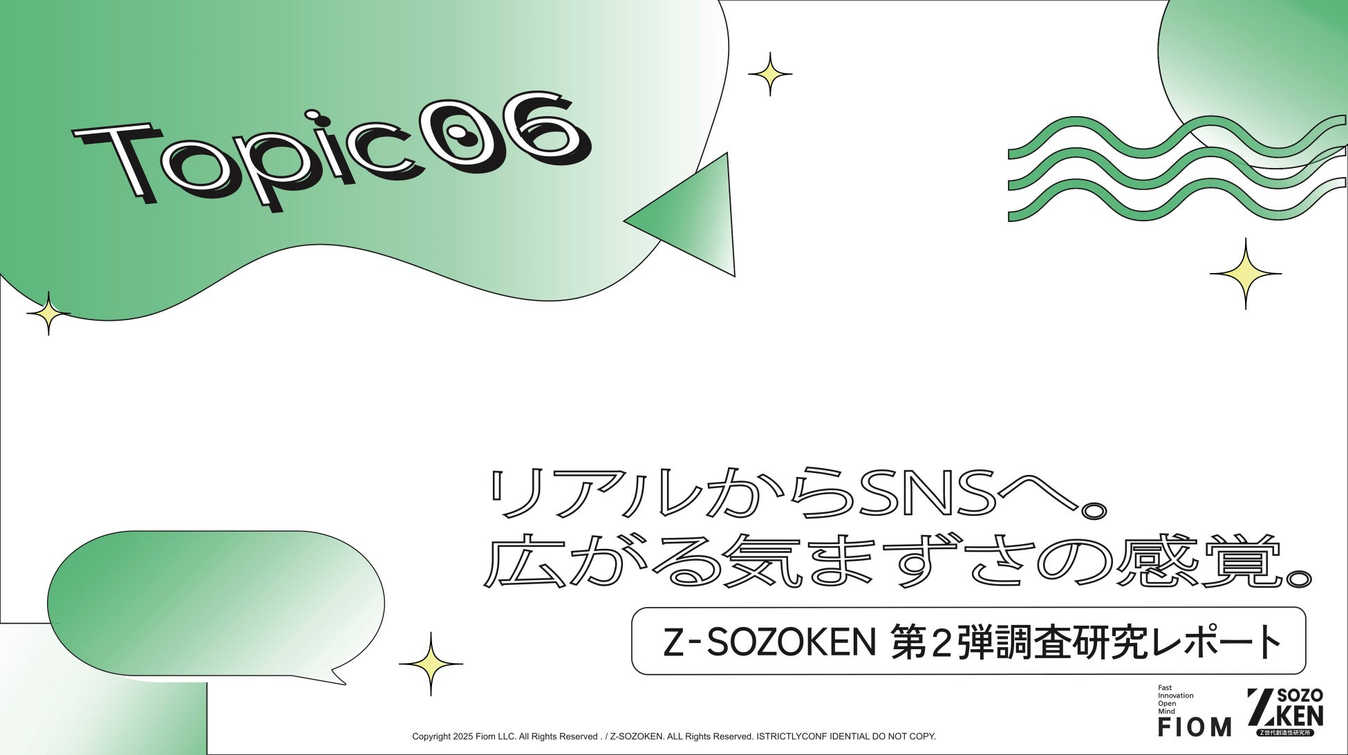 Z世代に特化したクリエイティブカンパニーFiom合同会社(本社:東京都渋谷区、代表社員:竹下洋平)が運営しているZ世代の実態や価値観を分析するシンクタンク、Z-SOZOKEN(Z世代創造性研究所)は、Z-SOZOKEN THINKTANK 最新調査研究レポートの第二弾として『Z世代の気まずいの感覚』についての調査研究レポートの第6章インサイトサマリー「リアルからSNSへ。広がる気まずさの感覚。」をリリースしました。