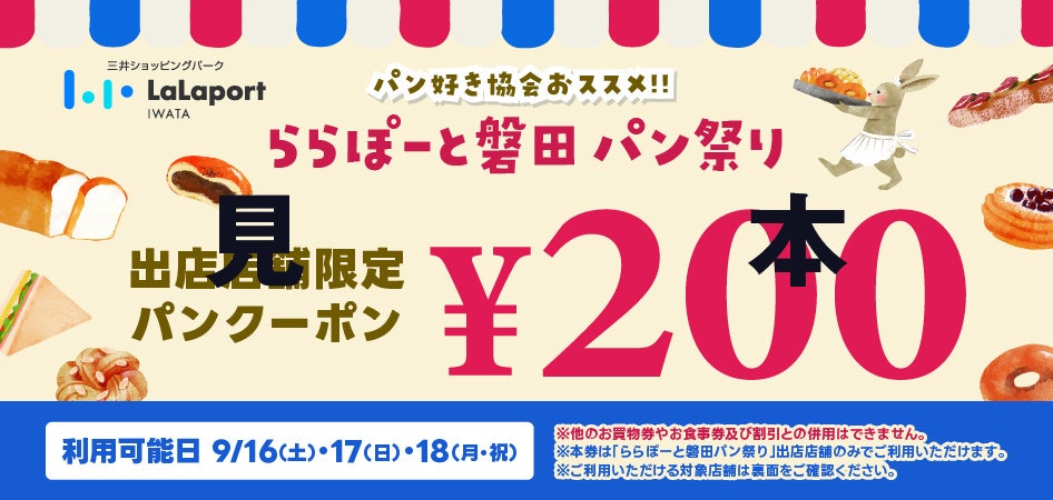 期間中、 三井ショッピングパークポイントLINE公式アカウントの友だち追加&「ららぽーと磐田」のお気に入り施設登録画面をご提示の方に、「ららぽーと磐田パン祭り」会場で使える200円クーポンをプレゼント!