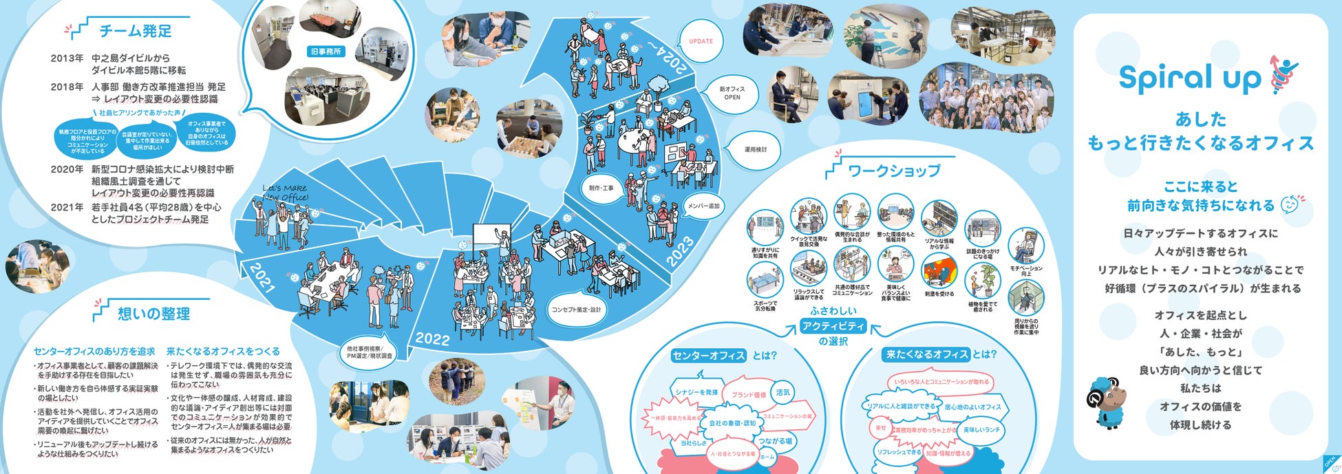 当社は、昨年、節目となる創立100周年を迎えるにあたり、20~30代の若手社員を中心としたプロジェクトチームを組成し、「Spiral up! あした、もっと行きたくなるオフィス」のコンセプトのもと、本社オフィスの大規模リニューアルを実施。オフィスビル事業者として、オフィスを起点に、人・企業・社会を「あした、もっと」良い方向へ向かわせたいとの想いで、センターオフィスのあり方を追求いたしました。コミュニケーションの活性化や生産性の向上を最大限に促すため、自宅やサテライトには無い「オフィスならでは」の施策を多数施し、新たなワーキングプレイスを構築しています。