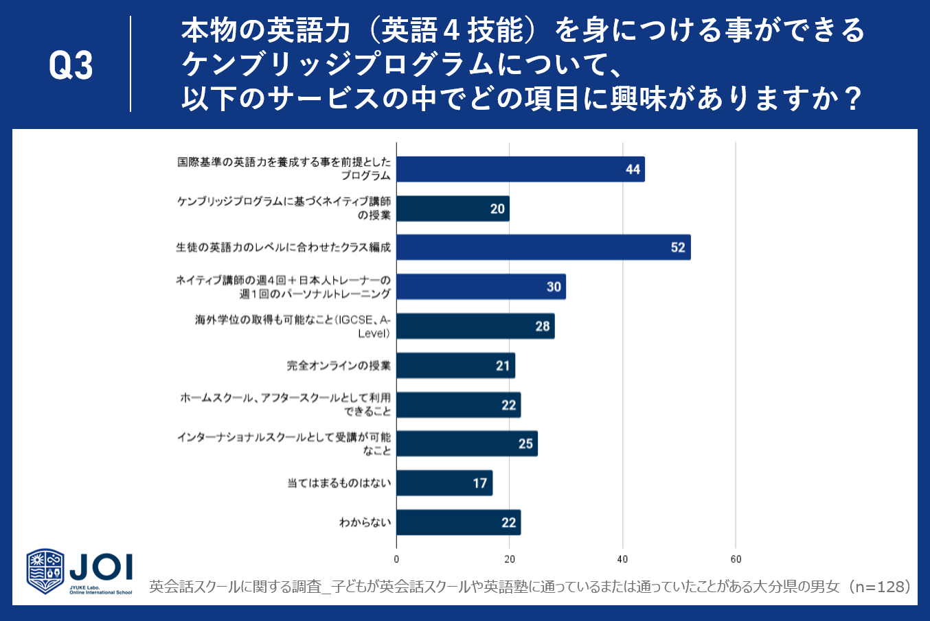 Q3で「本物の英語力(英語4技能)を身につける事ができるケンブリッジプログラムについて、以下のサービスの中でどの項目に興味がありますか?(複数回答可)」と質問したところ、大分県で最も多かったのは「生徒の英語力のレベルに合わせたクラス編成」で52名でした。次いで、「国際基準の英語力を養成する事を前提としたプログラム」には44名、「ネイティブ講師の週4回+日本人トレーナーの週1回のパーソナルトレーニング」には30名が興味を持っています。一方で、「完全オンラインの授業」や「ケンブリッジプログラムに基づくネイティブ講師の授業」に関心を持つ人はやや少なめで、それぞれ21名、20名の回答でした。これらの結果から、多くの人は実用的な英語力の養成や個別のニーズに応じた指導に重きを置いていることが伺えます。