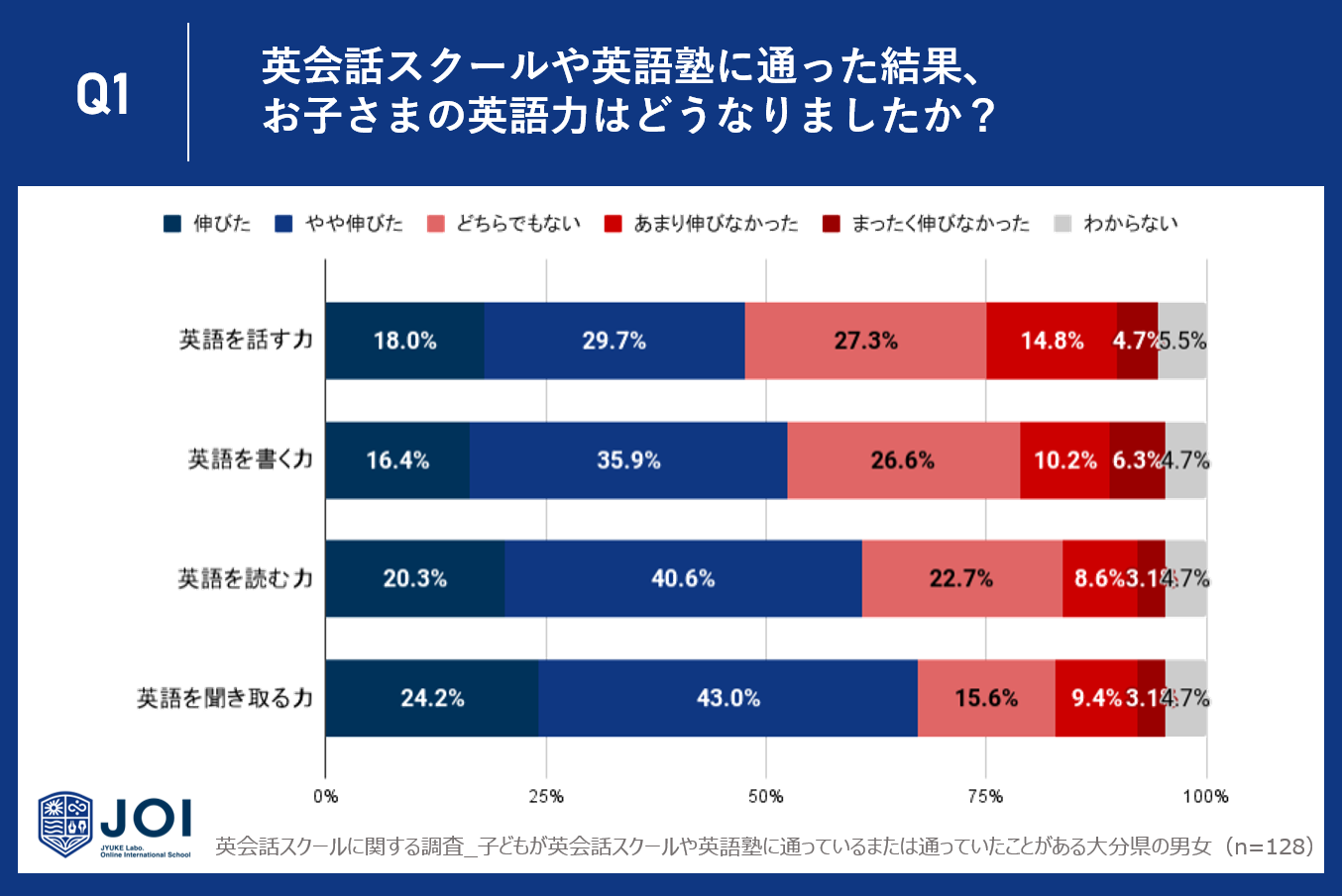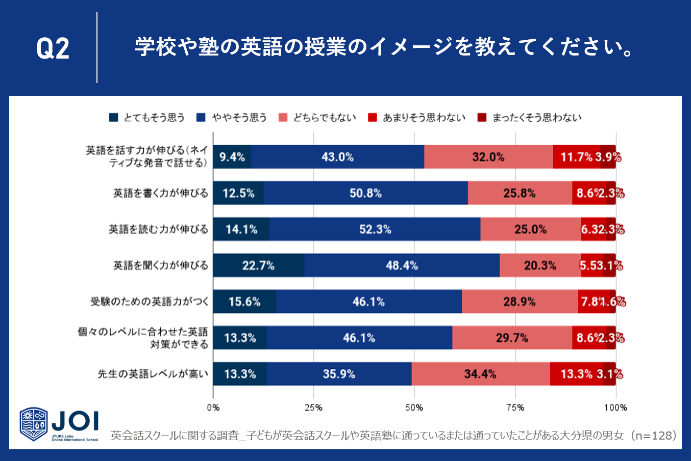 今回は、子どもが英会話スクールや英語塾に通っているまたは通っていたことがある大分県の男女128人に、英会話スクールや英語塾の効果に関するアンケート調査を実施しました。