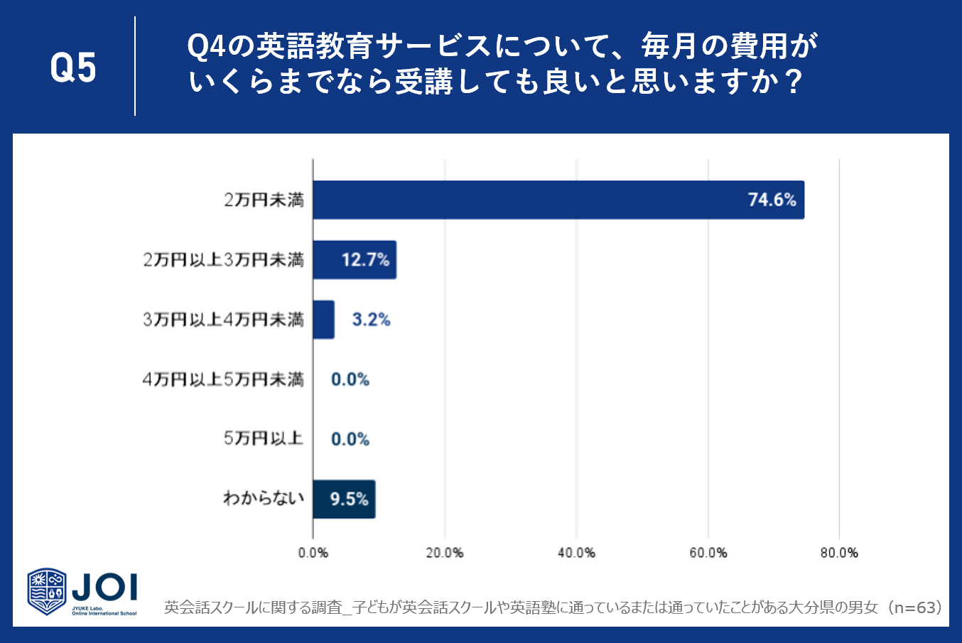 Q4で「受講したい」「料金が安ければ受講したい」「興味がある」と回答した人に、Q5で、「Q4の英語教育サービスについて、毎月の費用がいくらまでなら受講しても良いと思いますか?」と質問したところ、最も多い74.6%の回答者は2万円未満が適切と感じています。12.7%は2万円以上3万円未満、3.2%は3万円以上4万円未満と答えました。対照的に、4万円以上の費用を考える回答者は極少数で、4万円以上5万円未満、5万円以上ともに0.0%でした。これにより、大分県では多くの人が3万円未満の価格帯を望んでいることが明らかとなりました。