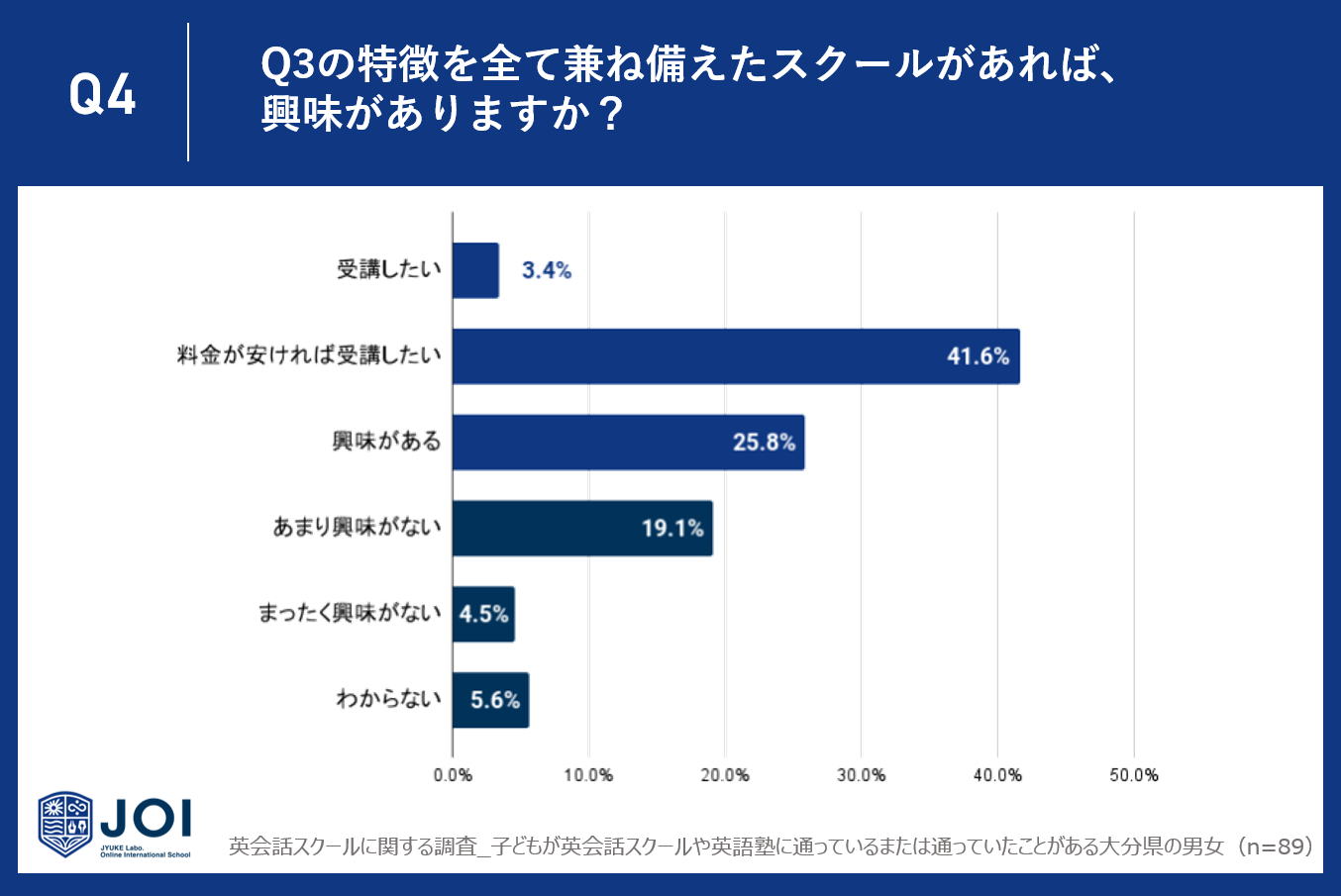 Q4で「Q3の特徴を全て兼ね備えたスクールがあれば、興味がありますか?」と質問したところ、大分県では3.4%が受講を希望し、41.6%は料金が手頃であれば受講したいと考えています。さらに、25.8%は興味を示していると回答しました。多くの人がこのような特徴を持つスクールに一定の興味を示していることが分かります。