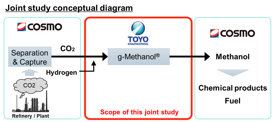 Toyo Engineering Corporation (TOYO, President and CEO Eiji Hosoi) and Cosmo Energy Holdings Co., Ltd. (Cosmo Energy Group, Representative Director and CEO Shigeru Yamada) today (October 23) concluded a basic agreement regarding a joint study aimed at direct synthesis of CO₂ into methanol using a catalyst.