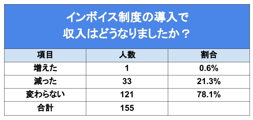 「インボイス制度の導入で収入はどうなりましたか?」という質問を行った結果、「増えた」と回答した方が1人(0.6%)、「減った」と回答した方が33人(21.3%)、「変わらない」と回答した方が121人(78.1%)という結果となりました。インボイス制度開始の前と後では取引先が減ったという方が13人のところ、収入になると減ったと回答した人が33人となりました。これは、生産者様の1取引先への販売額が減っていることが示唆されているのではないかと考えました。