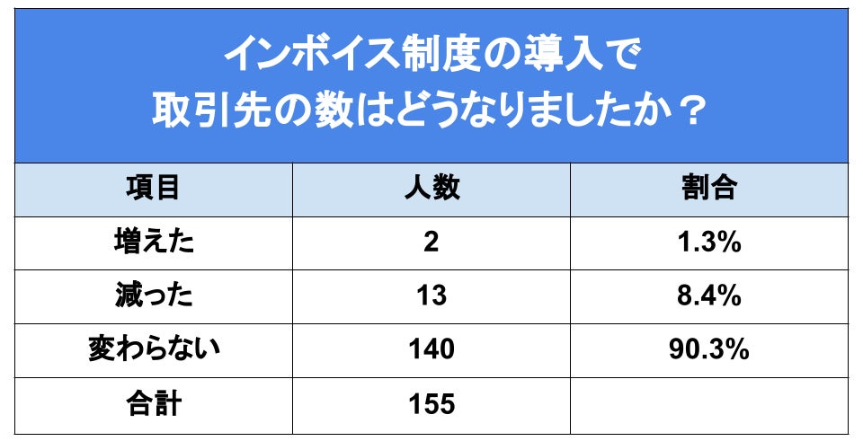 「インボイス制度の導入で取引先の数はどうなりましたか?」という質問を行った結果、「増えた」と回答した方が2人(1.3%)、「減った」と回答した方が13人(8.4%)、「変わらない」と回答した方が140人(90.3%)という結果となりました。ほとんどの生産者様が、インボイス制度開始の前と後では取引先の数が変わらないということがわかりました。
