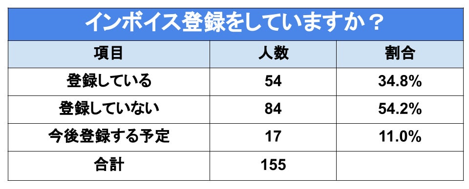 「インボイス登録をしていますか?」という質問を行った結果、「登録している」と回答した方が54人(34.8%)、「登録していない」と回答した方が84人(54.2%)、「今後登録する予定」と回答した方が17人(11%)という結果となりました。インボイス登録を行っている方と登録する予定の方の人数の合計が、登録していないという方の人数とほぼ同じとなりました。