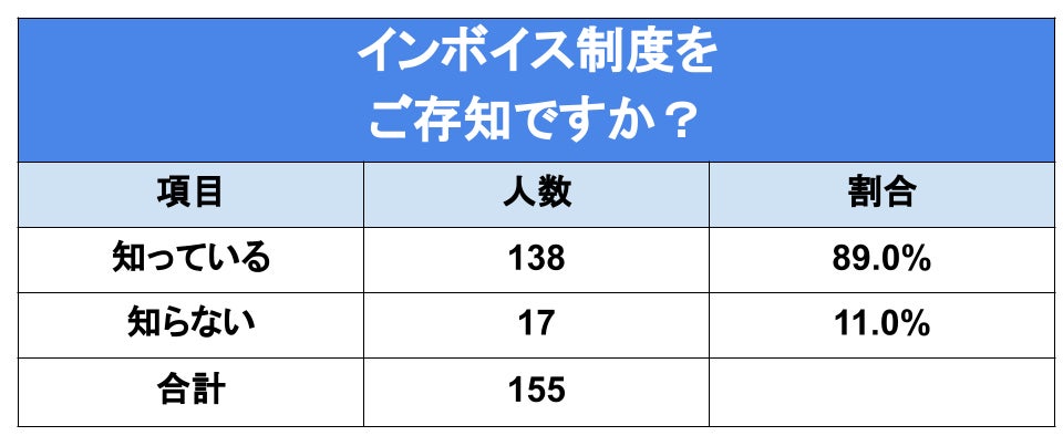 生産者様がインボイス制度についてどのように考えているかを調査するために「インボイス制度について」のアンケートを実施しました。「インボイス制度をご存知ですか?」という質問をアンケートにて行った結果、「知っている」と回答した方が138人と全体の89%、「知らない」と回答した方が17人と全体の11%を占めました。生産者様の中で、インボイス制度の認知度は高いということがわかりました。