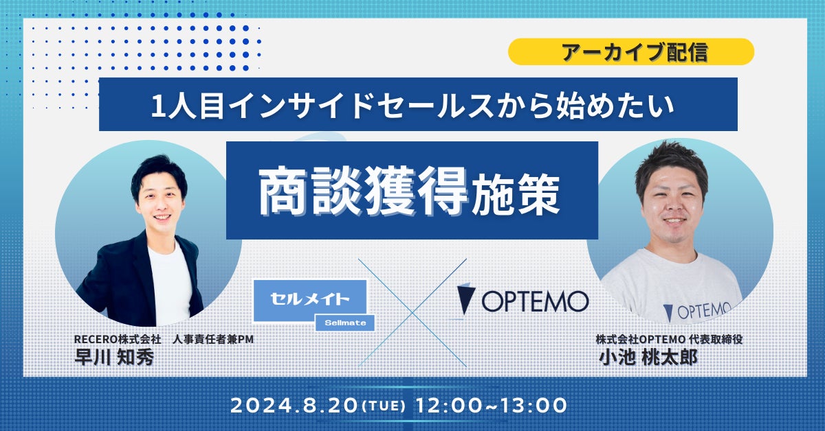 好評によりアーカイブ配信決定!BtoB SaaSのインサイドセールス支援事業を展開するRECERO株式会社とWEB接客ツールを提供する株式会社OPTEMOは、企業のインサイドセールス責任者/担当者向けに、「1人目インサイドセールスから始めたい商談獲得施策」というテーマの無料のオンラインウェビナーをアーカイブ配信にて開催します。
