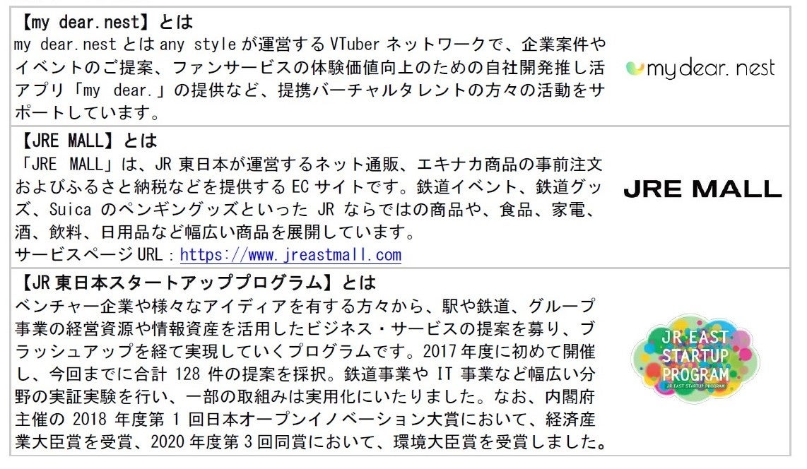 〇東日本旅客鉄道株式会社(代表取締役社長:喜㔟陽一、以下「 JR 東日本」)、株式会社 JR東日本商事(代表取締役社長:井上晋一)、JR東日本スタートアップ株式会社(代表 取締役社長:柴田裕)は、 JR 東日本スタートアッププログラム 2023 秋の採択企業で あり、 VTuber 推し活アプリ「my dear.」 や VTuber ネットワーク 「my dear. nest 」を活用したマーケティング事業の提供を行う、株式会社 any style(代表取締役:萩原 湧人、以下「 any style 」)と連携し、 JRE MALL初となる VTuber による地産品を集 めたライブコマース「JRE MALL × my dear. nest VTuber地域応援プロジェクト」を 実施します。