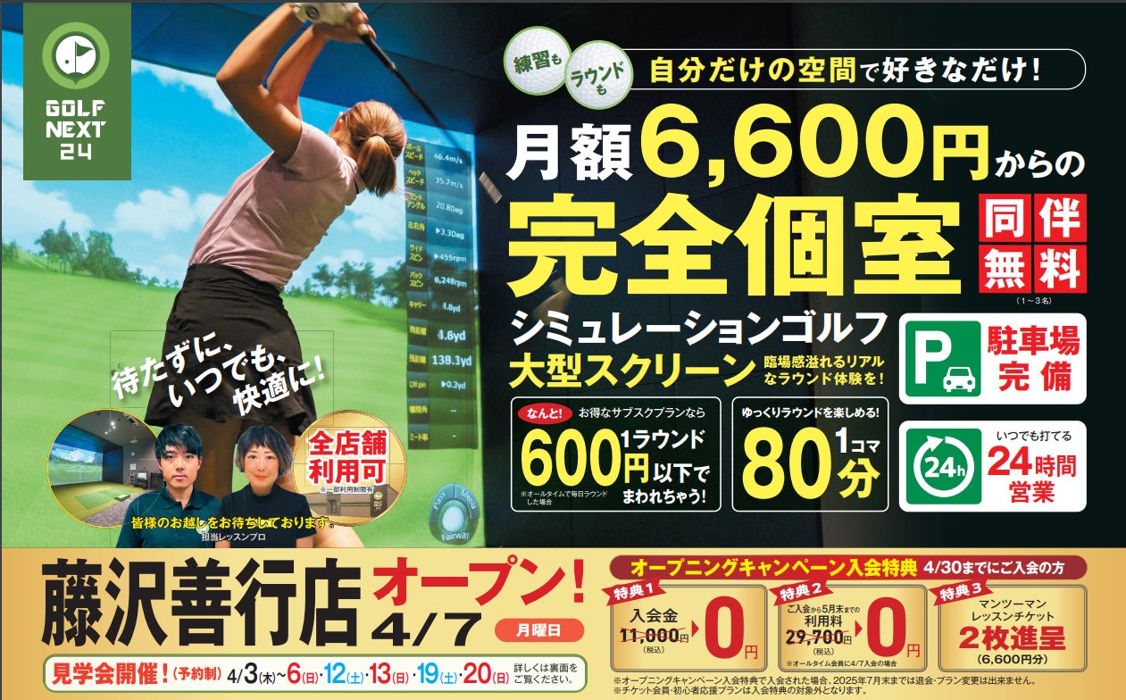 GOLF NEXT 24を展開するワイムシェアリング株式会社(本社:東京都新宿区、代表取締役:佐藤 直史)は、4月に東京・神奈川に新店舗「GOLF NEXT 24藤沢善行店」「GOLF NEXT 24シテヌーブ北千住店」をオープンします。新店舗は、広々とした全室個室による快適な空間でお客様をお迎えいたします。詳細は公式サイト(https://golfnext24.jp/)でご覧いただけます。