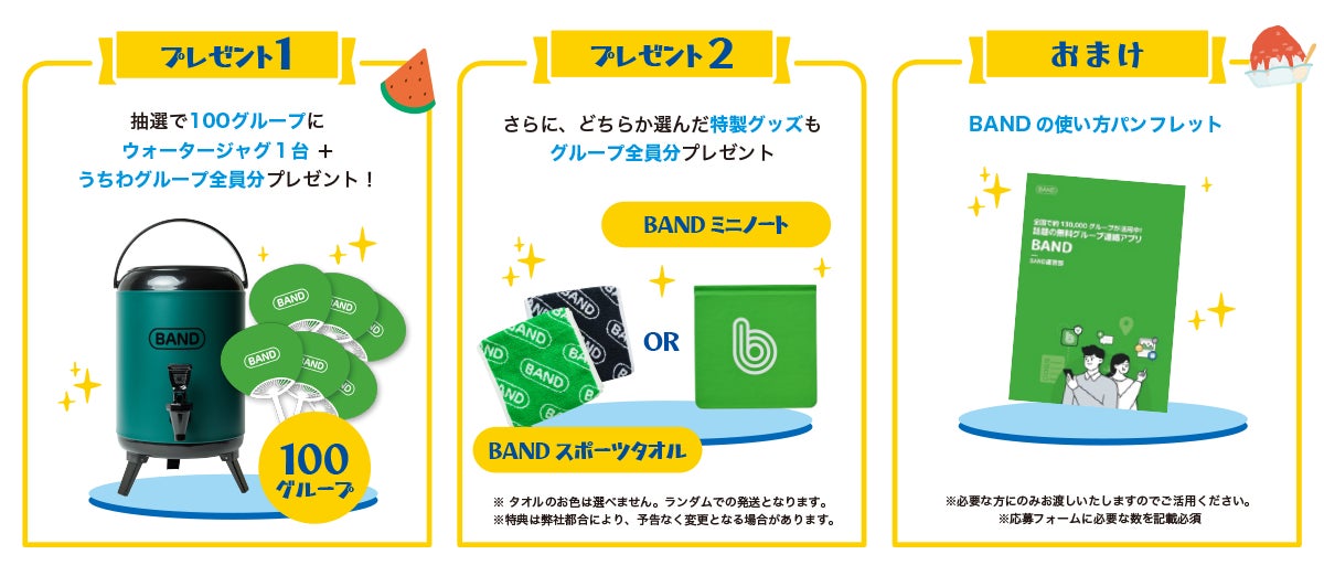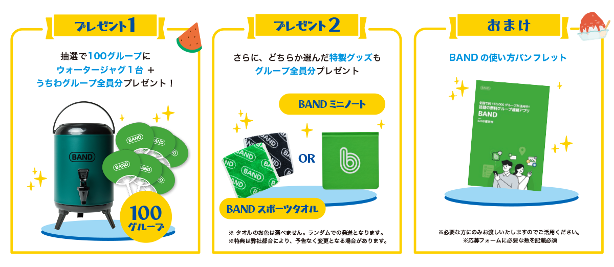 さらに!選べる「スポーツタオル」「ミニノート」など夏の特別なオリジナルグッズはもちろん、はじめてBANDを使う方のために役に立つ「BANDの使い方パンフレット」をプレゼントします。