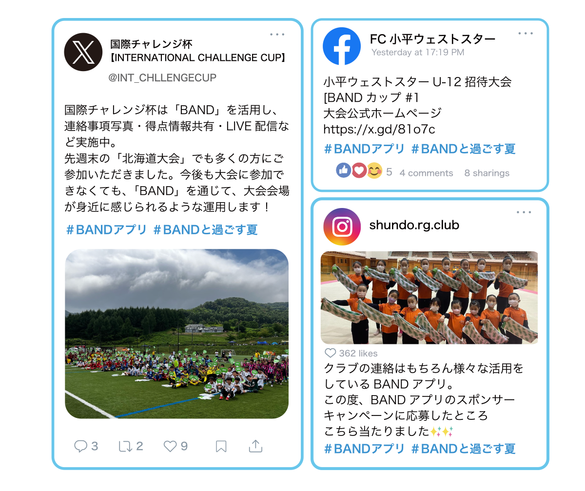 「BAND」は、スポーツチーム、部活、学校、PTA、会社、習いごと、オンラインサロンなど、さまざまなグループ内のコミュニケーションに活用されています。