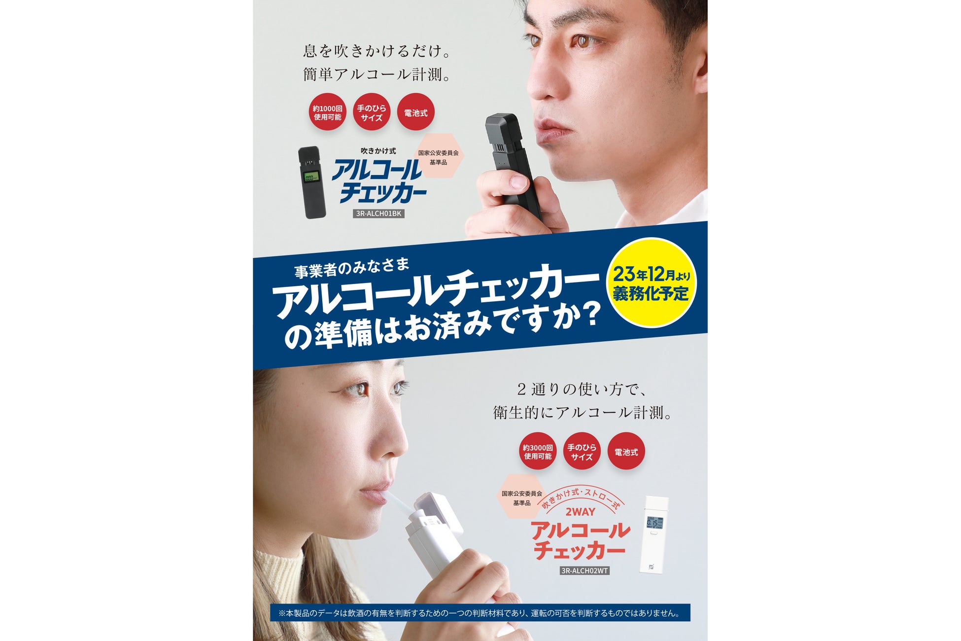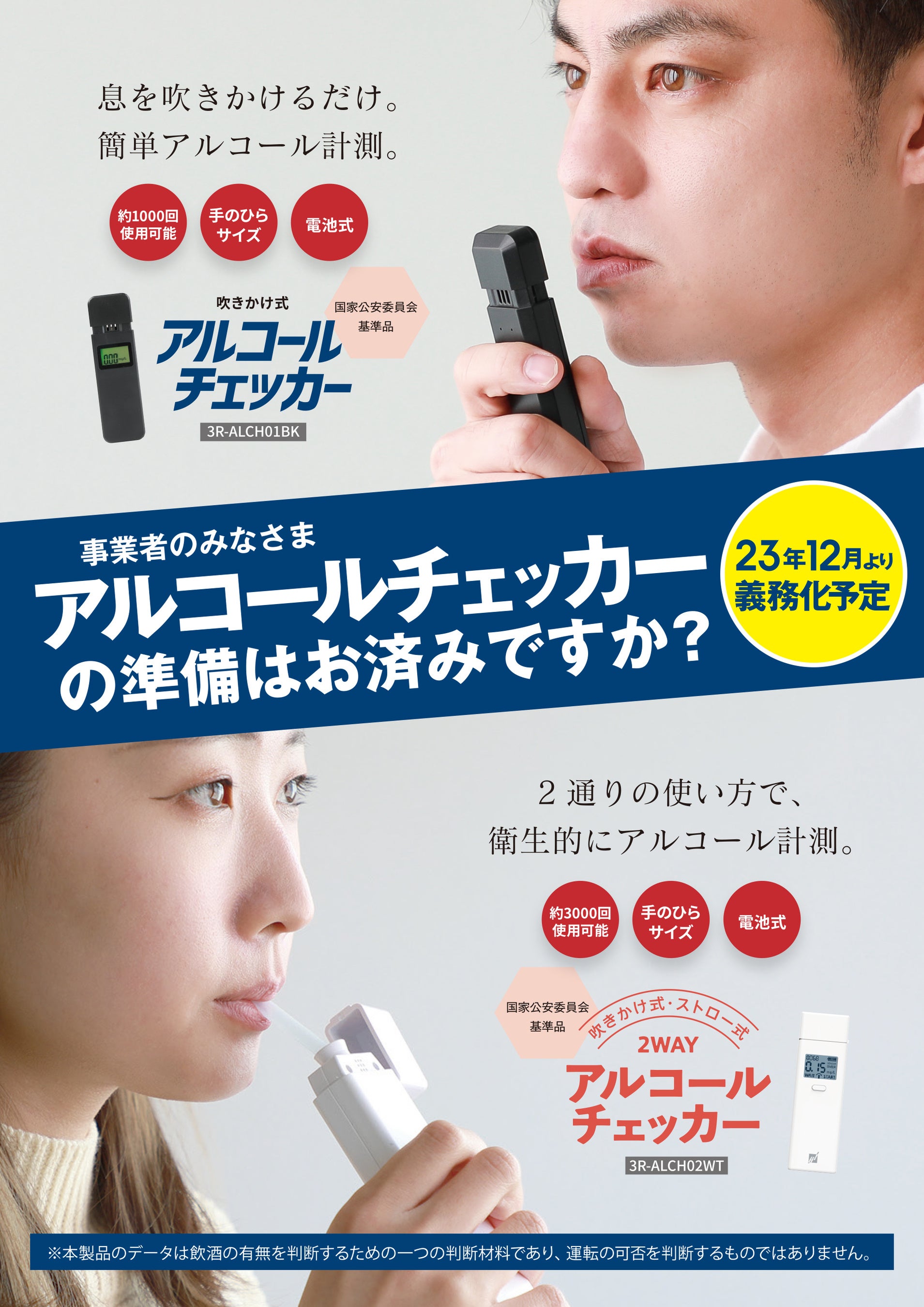 2023年12月1日より始まる見通しのアルコール検知器による飲酒検査の義務化。その対策のためにすでに多数のお問い合わせをいただいており、国家公安委員会 基準品でありコストパフォーマンスが優れている当社のアルコールチェッカーが多くのお客さまに選ばれています。